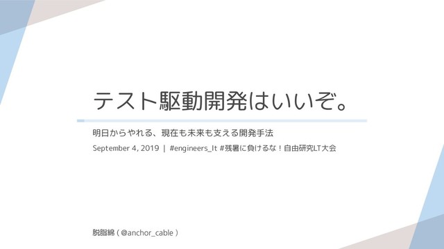 テスト駆動開発はいいぞ。 September 4, 2019 | #engineers_lt #残暑に負けるな!自由研究LT大会 明日からやれる、現在も未来も支える開発手法 脱脂綿 (
