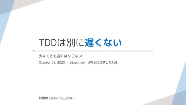 TDDは別に遅くない October 29, 2020 | #dasshimen #完全に理解したTalk 少なくとも遅くはならない 脱脂綿 (