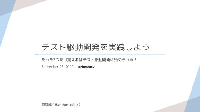 テスト駆動開発を実践しよう September 25, 2019 | #phpstudy たった3つだけ覚えればテスト駆動開発は始められる! 脱脂綿 ( @anchor_cable