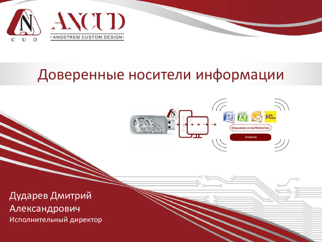 и флэш-памятью и выполнения прочих операций • Флэш-память 4 или 16 Гбайт (расширяемая до 64 Гбайт) Собственное ПО микроконтроллера • Модифицированный протокол USB • Собственный протокол работы с флэш-памятью Мощный процессор Большие вычислительные возможности для выполнения дополнительных функций: протоколирования, теневого копирования, разграничения доступа к областям флэш-памяти и т. п. Защищенный корпус • Металлический корпус с улучшенными специальными свойствами • Противоударность и пылезащищенность • Существует вариант в обычном пластиковом корпусе Вариант с клавиатурой на корпусе • Наличие аккумулятора для взаимодействия с носителем, не подключенным к компьютеру • Парольная аутентификация на чтение, запись и полный доступ к флэш-памяти Оригинальный разъем • USB-разъем в форм-факторе HDMI • Наличие переходника для подключения к обычному порту USB