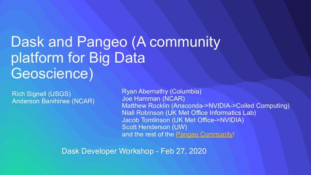 with dask (work around using xr.to_zarr(append=True) Memory Backpressure issue (D.E Shaw’s graph manipulation tools!) • Dask-cloudprovider very attractive to orgs like USGS: FargateCluster “rate exceeded” issue • Community understanding of chunking impact on use • Dask Performance challenges, e.g. pangeo/#194, dask/#3595 ◦ More work on graph optimization, high-level graphs, task-fusion, etc.. • Dask-deployment: More work on enabling heterogeneous worker pools, harmonization among systems, etc...