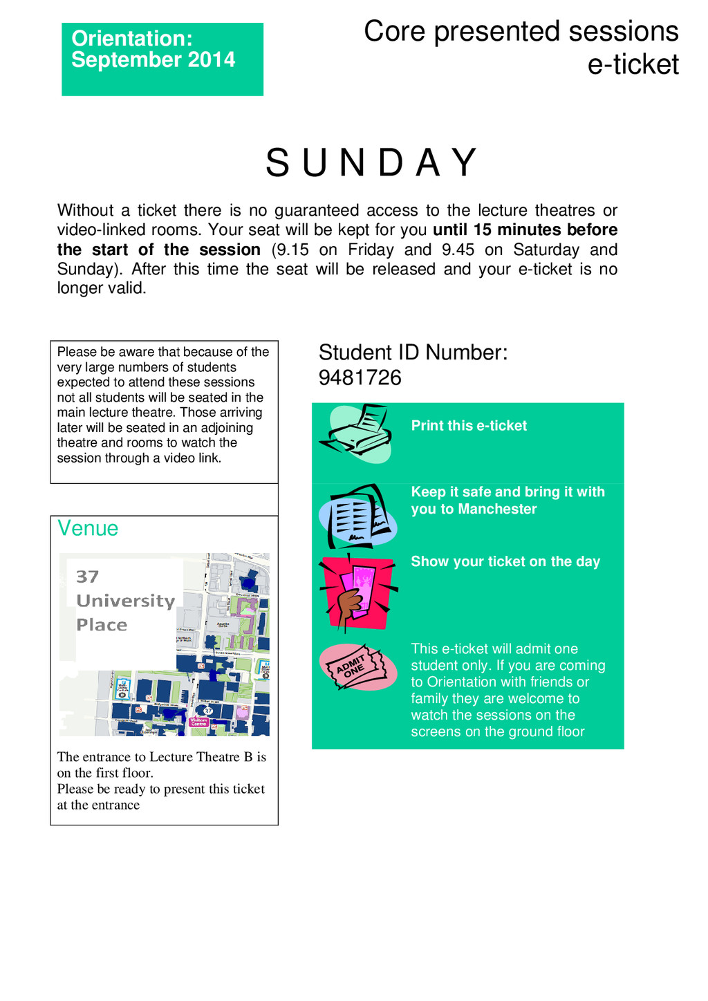 Without a ticket there is no guaranteed access to the lecture theatres or video-linked rooms. Your seat will be kept for you until 15 minutes before the start of the session (9.15 on Friday and 9.45 on Saturday and Sunday). After this time the seat will be released and your e-ticket is no longer valid. Please be aware that because of the very large numbers of students expected to attend these sessions not all students will be seated in the main lecture theatre. Those arriving later will be seated in an adjoining theatre and rooms to watch the session through a video link. Student ID Number: 9481726 Print this e-ticket Keep it safe and bring it with you to Manchester Venue Show your ticket on the day This e-ticket will admit one student only. If you are coming to Orientation with friends or family they are welcome to watch the sessions on the screens on the ground floor The entrance to Lecture Theatre B is on the first floor. Please be ready to present this ticket at the entrance Orientation: September 2014