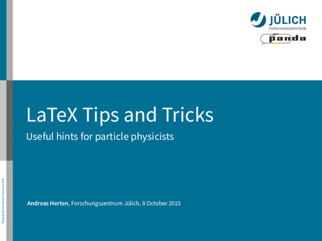 insertion of a space in your own commands (e.g. \newcommand{\something}{something\xspace} ) (CTAN) Also: \ensuremath{command} for using macro in every environment My panda package, which prints a beautiful PANDA and is context-aware (on Github) gitinfo2, enabling display of metadata of Git version control into your L A TEX documents. Useful to display versions of a document. (CTAN: v1, v2) feynmp & feynmp-auto for drawing Feynman Diagrams in the document (CTAN) γ, Z0 e− e+ e+, µ+ e−, µ+ i √ α i √ α 12/29 Andreas Herten | IKP 1 Seminar | 8 October 2015
