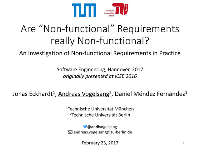 Méndez Fernández1 @andivogelsang [email protected] Software Engineering, Hannover, 2017 originally presented at ICSE 2016 An investigation of Non-functional Requirements in Practice 1Technische Universität München 2Technische Universität Berlin February 23, 2017 1