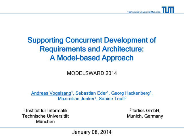 A Model-based Approach MODELSWARD 2014 January 08, 2014 Andreas Vogelsang1, Sebastian Eder1, Georg Hackenberg1, Maximilian Junker1, Sabine Teufl2 2 fortiss GmbH, Munich, Germany 1 Institut für Informatik Technische Universität München