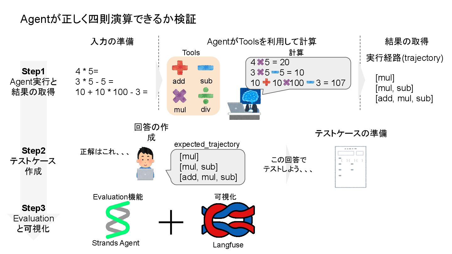 10 + 10 * 100 - 3 = AgentがToolsを利用して計算 入力の準備 実行経路(trajectory) [mul] [mul, sub] [add, mul, sub] add sub mul div 4 5 = 20 3 5 5 = 10 10 10 100 3 = 107 Tools 計算 結果の取得 Step1 Agent実行と 結果の取得 Step2 テストケース 作成 回答の作 成 テストケースの準備 [mul] [mul, sub] [add, mul, sub] 正解はこれ、、、 expected_trajectory Step3 Evaluation と可視化 Strands Agent この回答で テストしよう、、、 Evaluation機能 Langfuse 可視化