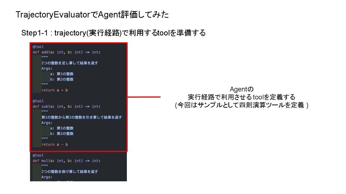 TrajectoryEvaluatorでAgent評価してみた Step1-1 : trajectory(実行経路)で利用するtoolを準備する Agentの 実行経路で利用させる toolを定義する (今回はサンプルとして四則演算ツールを定義 )