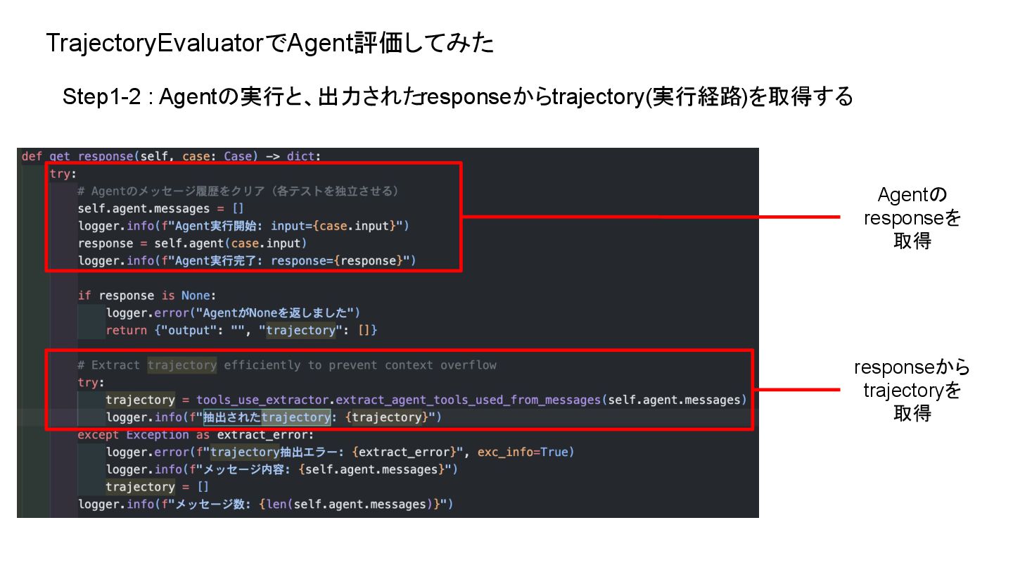 TrajectoryEvaluatorでAgent評価してみた Step1-2 : Agentの実行と、出力されたresponseからtrajectory(実行経路)を取得する Agentの responseを 取得 responseから trajectoryを 取得