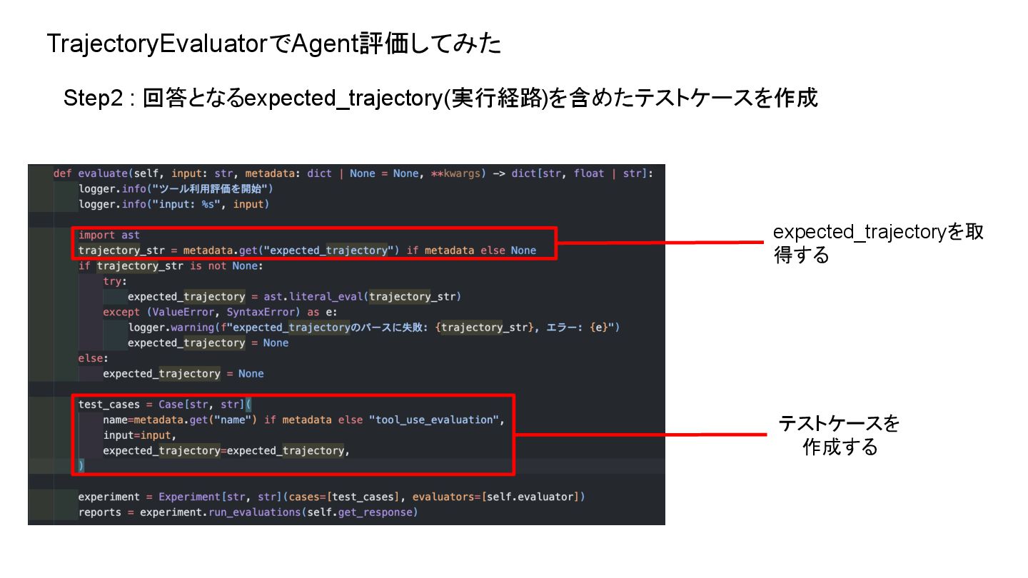 TrajectoryEvaluatorでAgent評価してみた Step2 : 回答となるexpected_trajectory(実行経路)を含めたテストケースを作成 expected_trajectoryを取 得する テストケースを 作成する