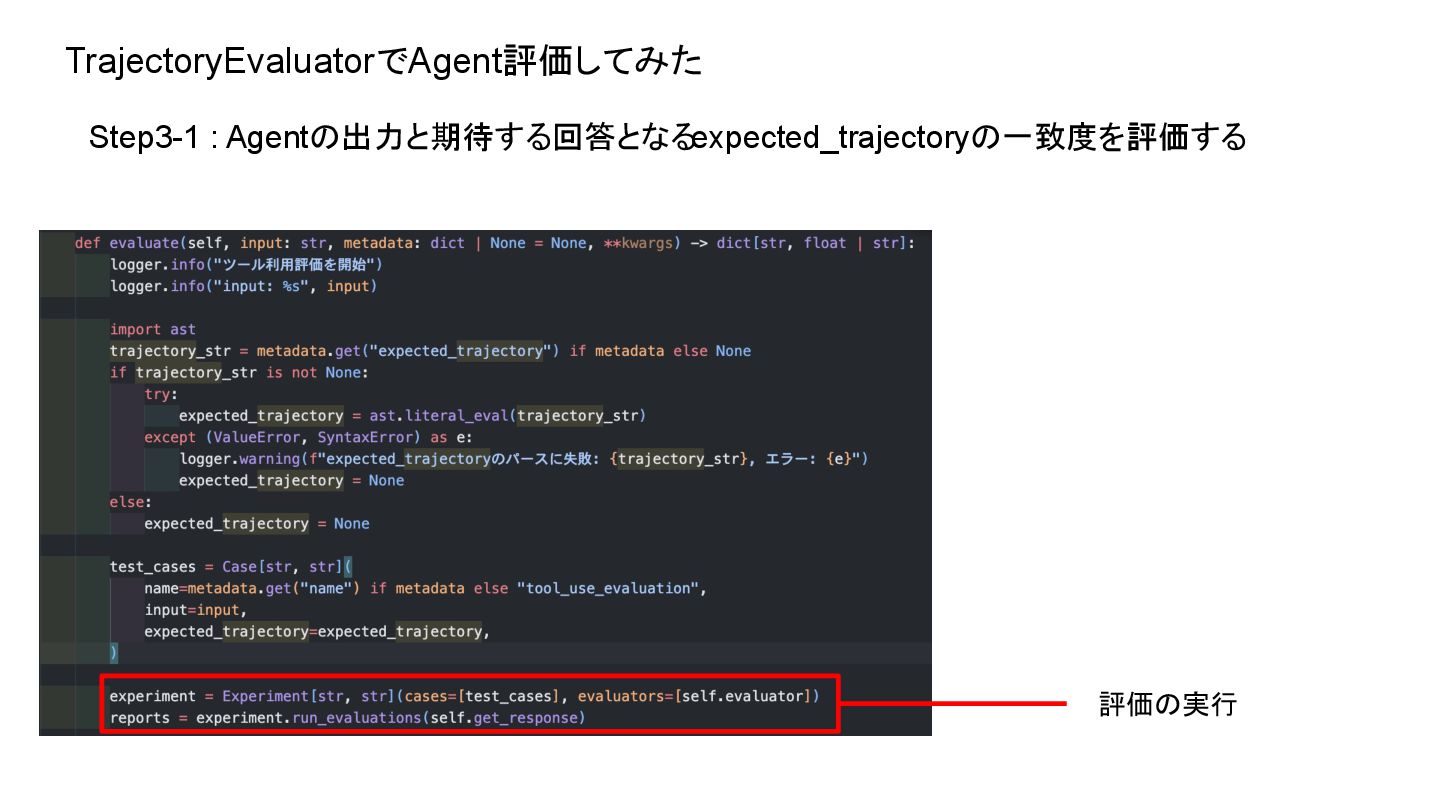 TrajectoryEvaluatorでAgent評価してみた Step3-1 : Agentの出力と期待する回答となるexpected_trajectoryの一致度を評価する 評価の実行