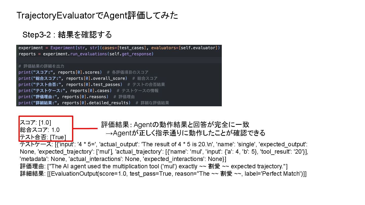 5=', 'actual_output': 'The result of 4 * 5 is 20.\n', 'name': 'single', 'expected_output': None, 'expected_trajectory': ['mul'], 'actual_trajectory': [{'name': 'mul', 'input': {'a': 4, 'b': 5}, 'tool_result': '20'}], 'metadata': None, 'actual_interactions': None, 'expected_interactions': None}] 評価理由: ["The AI agent used the multiplication tool ('mul') exactly ~~ 割愛 ~~ expected trajectory."] 詳細結果: [[EvaluationOutput(score=1.0, test_pass=True, reason="The ~~ 割愛 ~~, label='Perfect Match')]] TrajectoryEvaluatorでAgent評価してみた Step3-2 : 結果を確認する 評価結果:Agentの動作結果と回答が完全に一致 →Agentが正しく指示通りに動作したことが確認できる