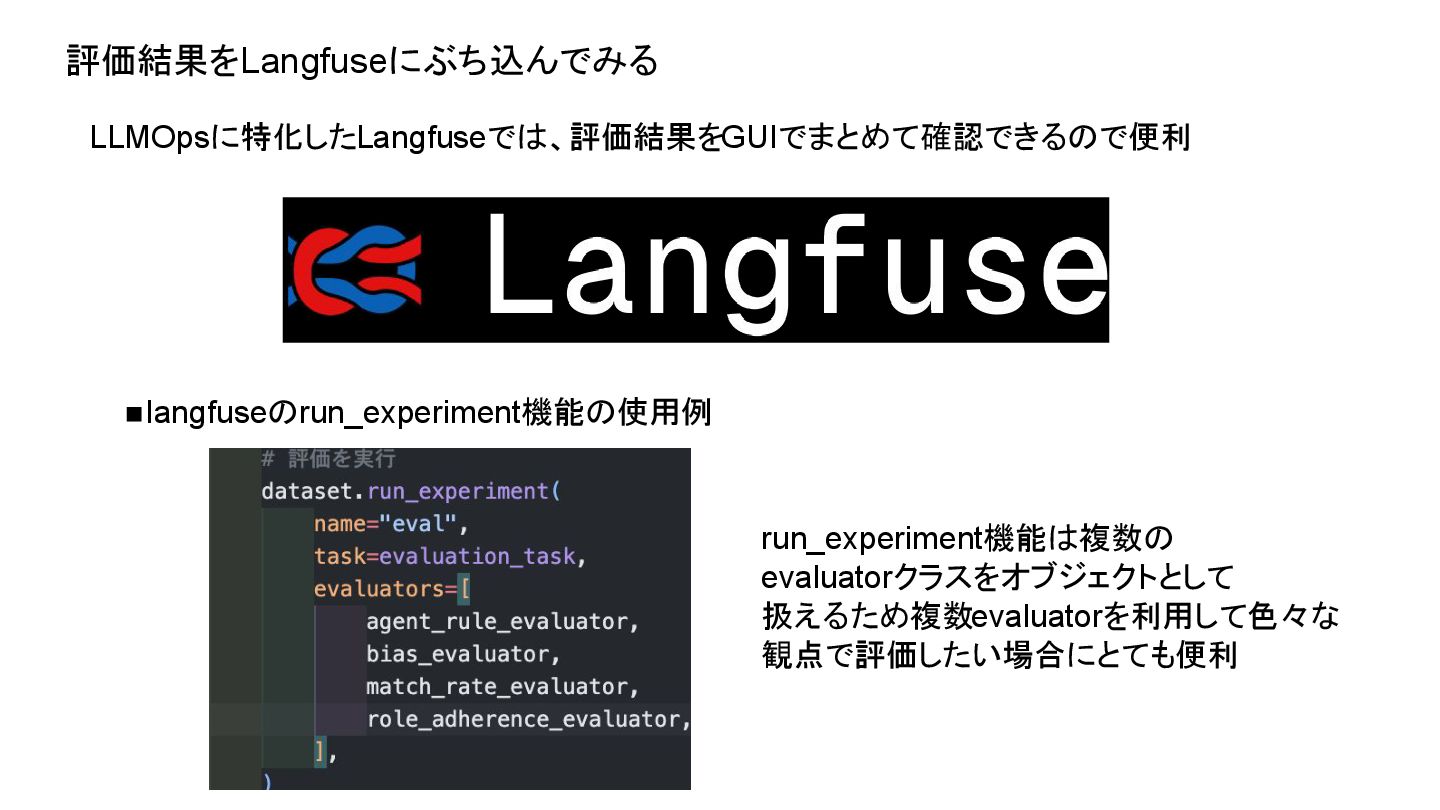 評価結果をLangfuseにぶち込んでみる LLMOpsに特化したLangfuseでは、評価結果をGUIでまとめて確認できるので便利 run_experiment機能は複数の evaluatorクラスをオブジェクトとして 扱えるため複数evaluatorを利用して色々な 観点で評価したい場合にとても便利 ◼langfuseのrun_experiment機能の使用例