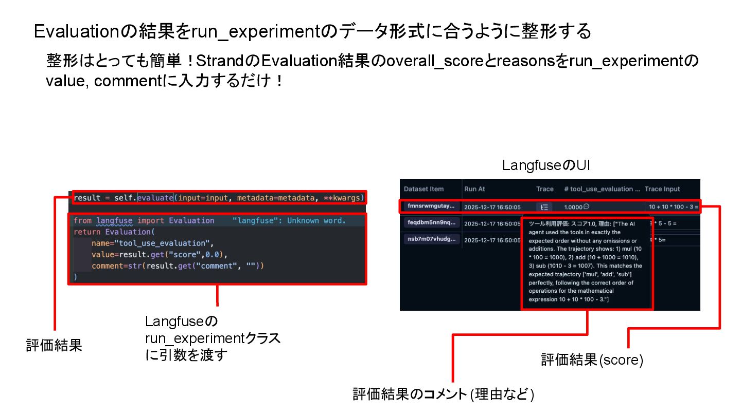 Evaluationの結果をrun_experimentのデータ形式に合うように整形する 整形はとっても簡単!StrandのEvaluation結果のoverall_scoreとreasonsをrun_experimentの value, commentに入力するだけ! 評価結果 Langfuseの run_experimentクラス に引数を渡す LangfuseのUI 評価結果のコメント(理由など)