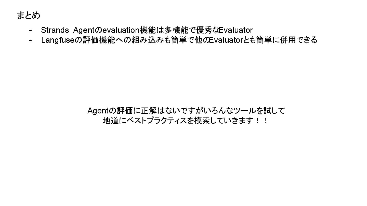 まとめ - Strands Agentのevaluation機能は多機能で優秀なEvaluator - Langfuseの評価機能への組み込みも簡単で他の Evaluatorとも簡単に併用できる Agentの評価に正解はないですがいろんなツールを試して 地道にベストプラクティスを模索していきます!!