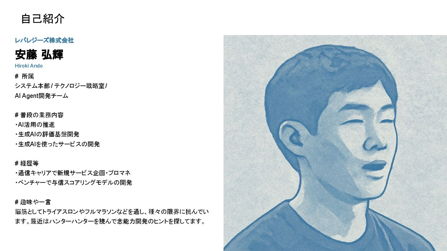 / AI Agent開発チーム # 普段の業務内容 ・AI活用の推進 ・生成AIの評価基盤開発 ・生成AIを使ったサービスの開発 # 経歴等 ・通信キャリアで新規サービス企画・プロマネ ・ベンチャーで与信スコアリングモデルの開発 # 趣味や一言 脳筋としてトライアスロンやフルマラソンなどを通し、種々の限界に挑んでい ます。最近はハンターハンターを読んで念能力開発のヒントを探してます。 レバレジーズ株式会社