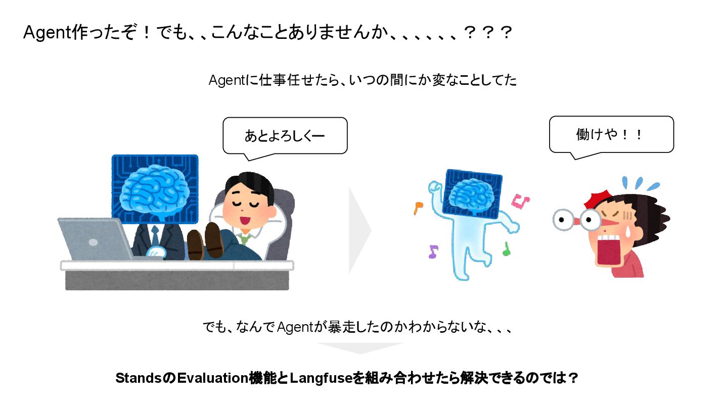Agent作ったぞ!でも、、こんなことありませんか、、、、、、??? Agentに仕事任せたら、いつの間にか変なことしてた あとよろしくー 働けや!! でも、なんでAgentが暴走したのかわからないな、、、 StandsのEvaluation機能とLangfuseを組み合わせたら解決できるのでは?