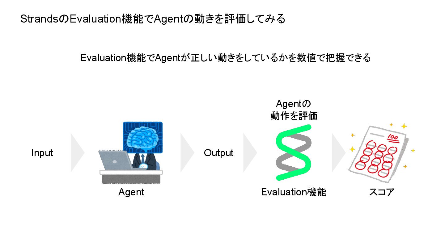StrandsのEvaluation機能でAgentの動きを評価してみる Evaluation機能でAgentが正しい動きをしているかを数値で把握できる Input Agentの 動作を評価 Evaluation機能 Agent Output スコア