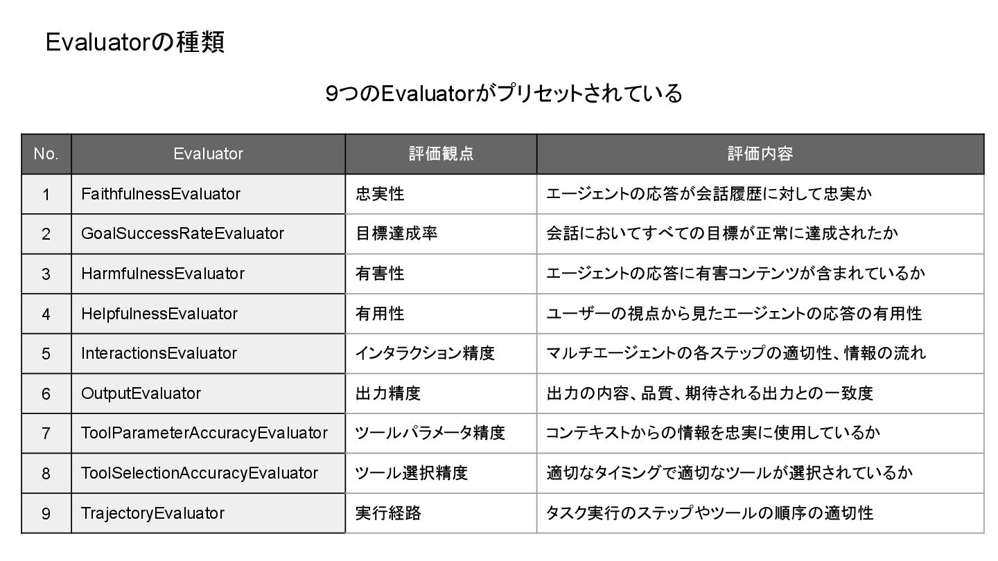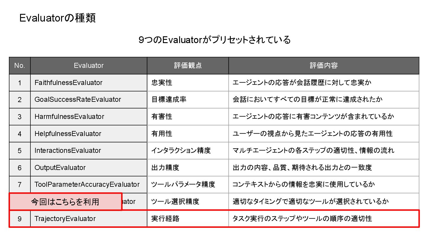 GoalSuccessRateEvaluator 目標達成率 会話においてすべての目標が正常に達成されたか 3 HarmfulnessEvaluator 有害性 エージェントの応答に有害コンテンツが含まれているか 4 HelpfulnessEvaluator 有用性 ユーザーの視点から見たエージェントの応答の有用性 5 InteractionsEvaluator インタラクション精度 マルチエージェントの各ステップの適切性、情報の流れ 6 OutputEvaluator 出力精度 出力の内容、品質、期待される出力との一致度 7 ToolParameterAccuracyEvaluator ツールパラメータ精度 コンテキストからの情報を忠実に使用しているか 8 ToolSelectionAccuracyEvaluator ツール選択精度 適切なタイミングで適切なツールが選択されているか 9 TrajectoryEvaluator 実行経路 タスク実行のステップやツールの順序の適切性 9つのEvaluatorがプリセットされている 今回はこちらを利用