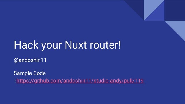 Hack your Nuxt router! @andoshin11 Sample Code :https://github.com/andoshin11/studio-andy/pull/119
