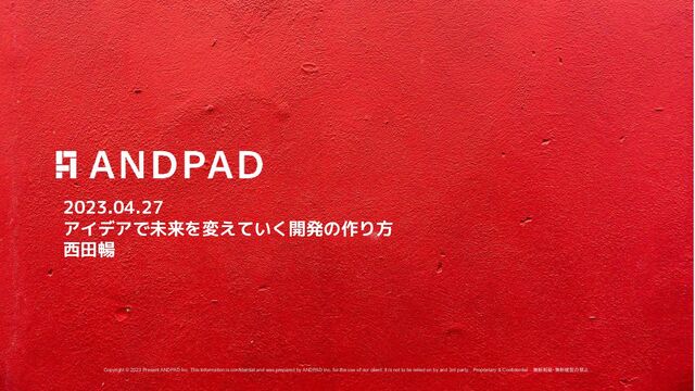 and was prepared by ANDPAD Inc. for the use of our client. It is not to be relied on by and 3rd party. Proprietary & Confidential 無断転載・無断複製の禁止 2023.04.27 アイデアで未来を変えていく開発の作り方 西田暢