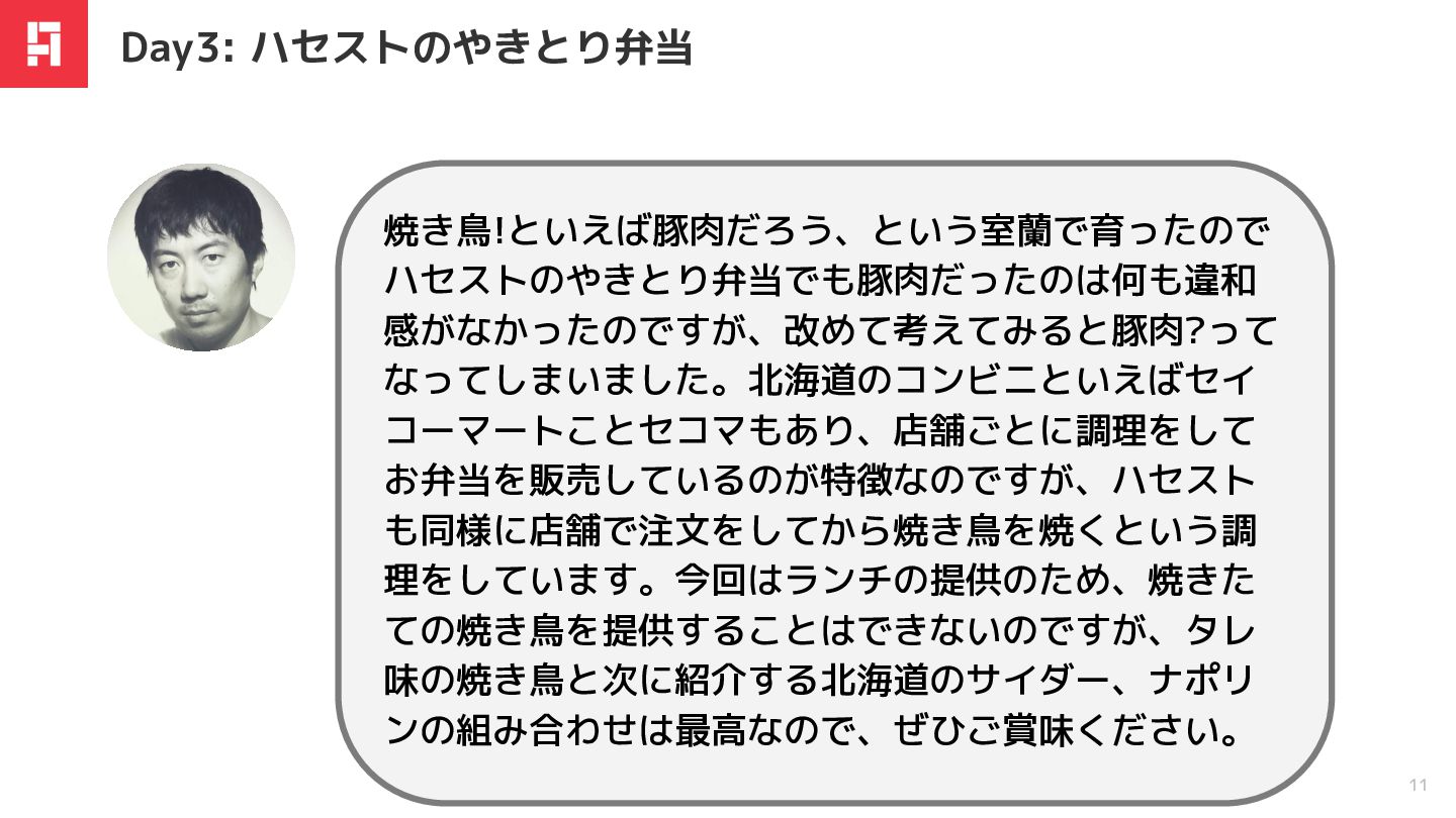 なってしまいました。北海道のコンビニといえばセイ コーマートことセコマもあり、店舗ごとに調理をして お弁当を販売しているのが特徴なのですが、ハセスト も同様に店舗で注文をしてから焼き鳥を焼くという調 理をしています。今回はランチの提供のため、焼きた ての焼き鳥を提供することはできないのですが、タレ 味の焼き鳥と次に紹介する北海道のサイダー、ナポリ ンの組み合わせは最高なので、ぜひご賞味ください。 Day3: ハセストのやきとり弁当