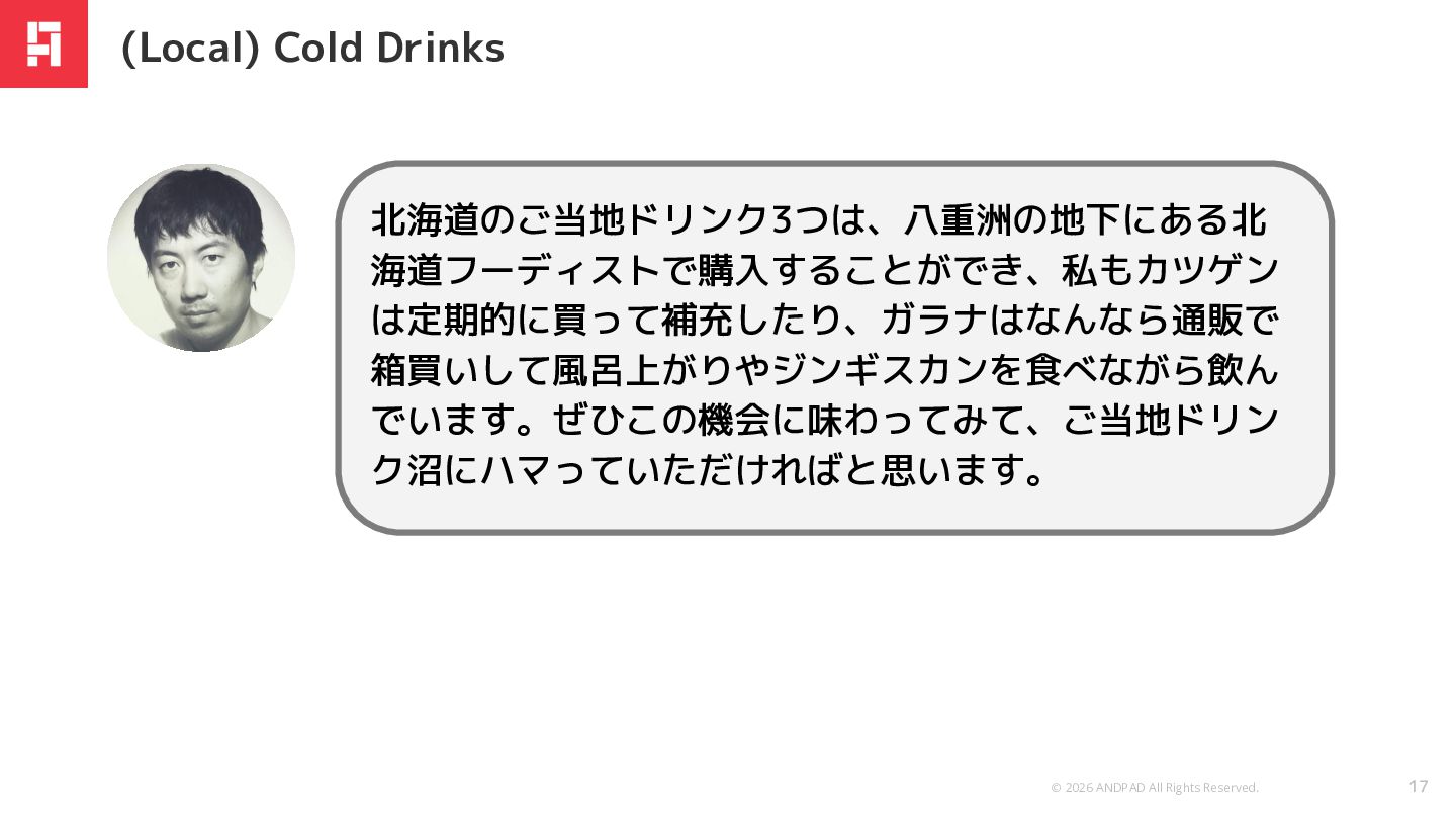 © 2026 ANDPAD All Rights Reserved. 17 北海道のご当地ドリンク3つは、八重洲の地下にある北 海道フーディストで購入することができ、私もカツゲン は定期的に買って補充したり、ガラナはなんなら通販で