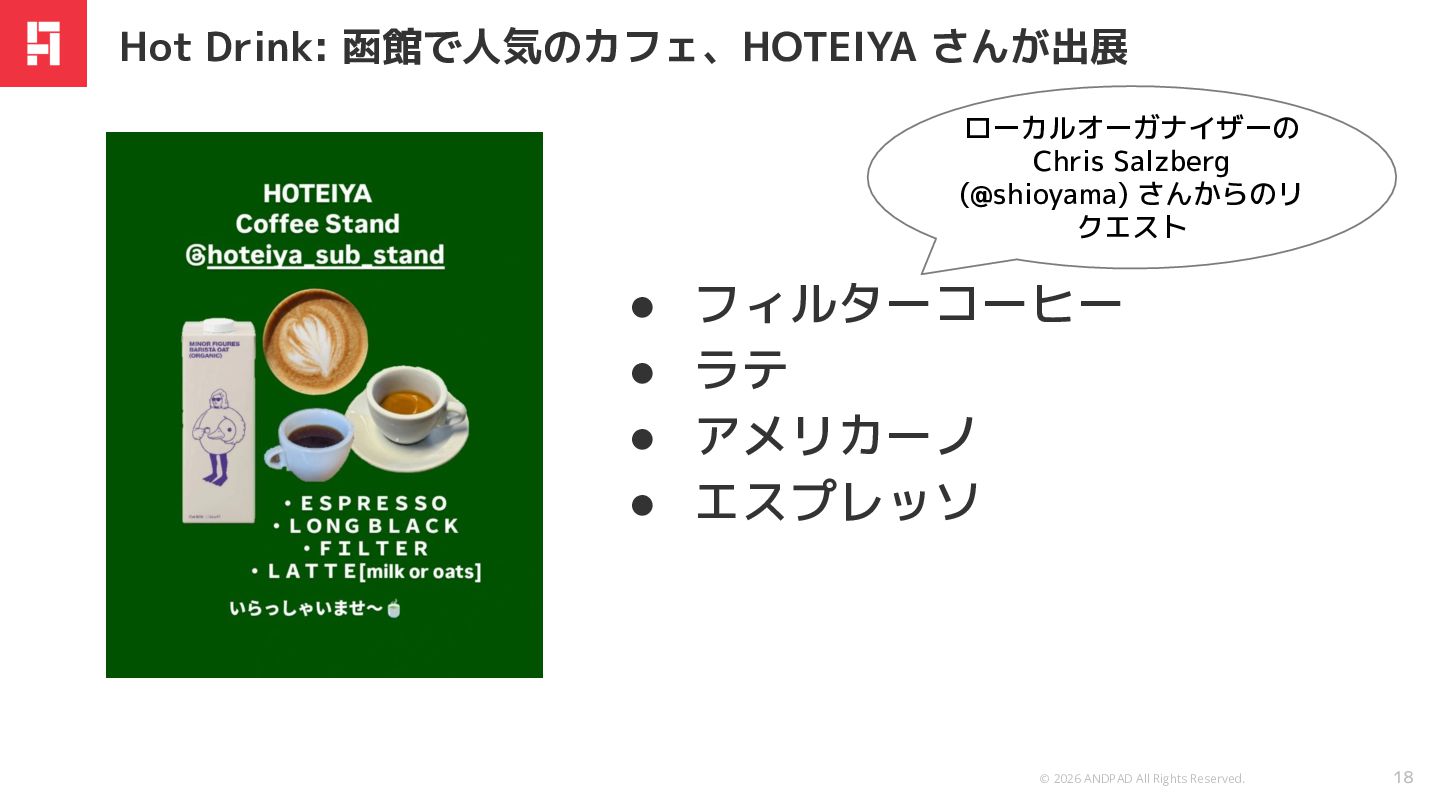 © 2026 ANDPAD All Rights Reserved. 18 Hot Drink: 函館で人気のカフェ、HOTEIYA