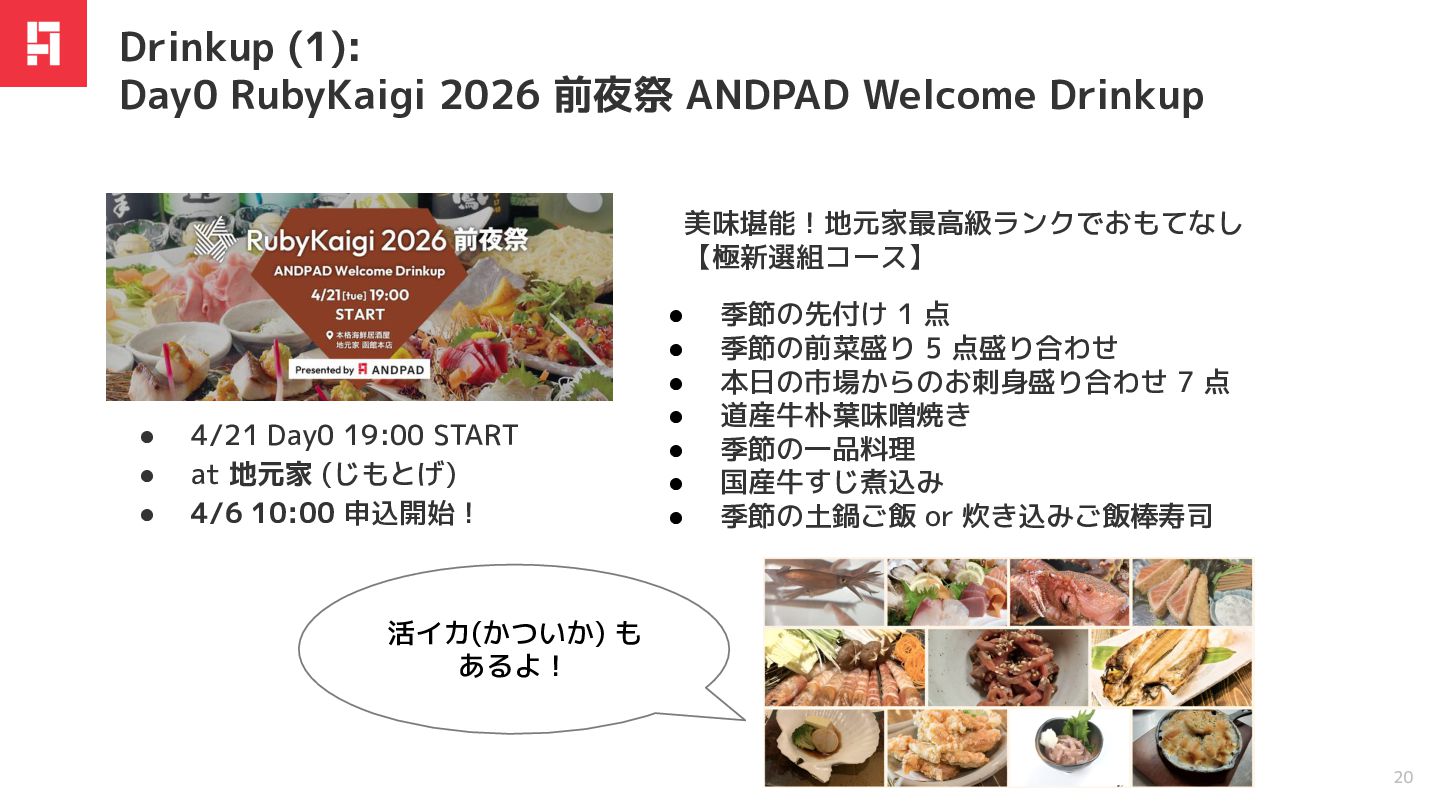 RubyKaigi 2026 前夜祭 ANDPAD Welcome Drinkup • 4/21 Day0 19:00 START • at 地元家 (じもとげ) • 4/6 10:00 申込開始! 美味堪能!地元家最高級ランクでおもてなし 【極新選組コース】 • 季節の先付け 1 点 • 季節の前菜盛り 5 点盛り合わせ • 本日の市場からのお刺身盛り合わせ 7 点 • 道産牛朴葉味噌焼き • 季節の一品料理 • 国産牛すじ煮込み • 季節の土鍋ご飯 or 炊き込みご飯棒寿司 活イカ(かついか) も あるよ!