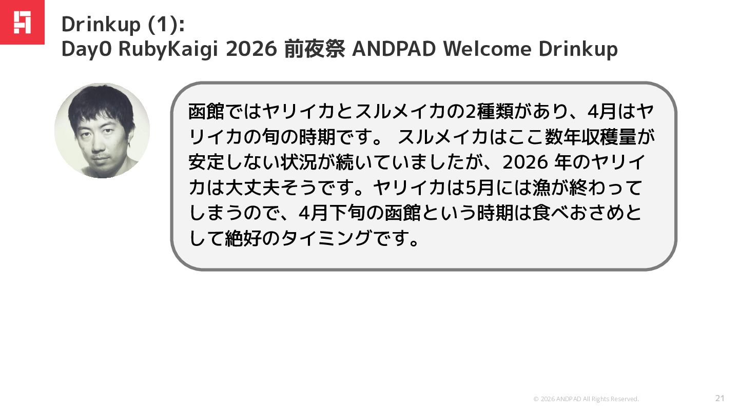 安定しない状況が続いていましたが、2026 年のヤリイ カは大丈夫そうです。ヤリイカは5月には漁が終わって しまうので、4月下旬の函館という時期は食べおさめと して絶好のタイミングです。 Drinkup (1): Day0 RubyKaigi 2026 前夜祭 ANDPAD Welcome Drinkup