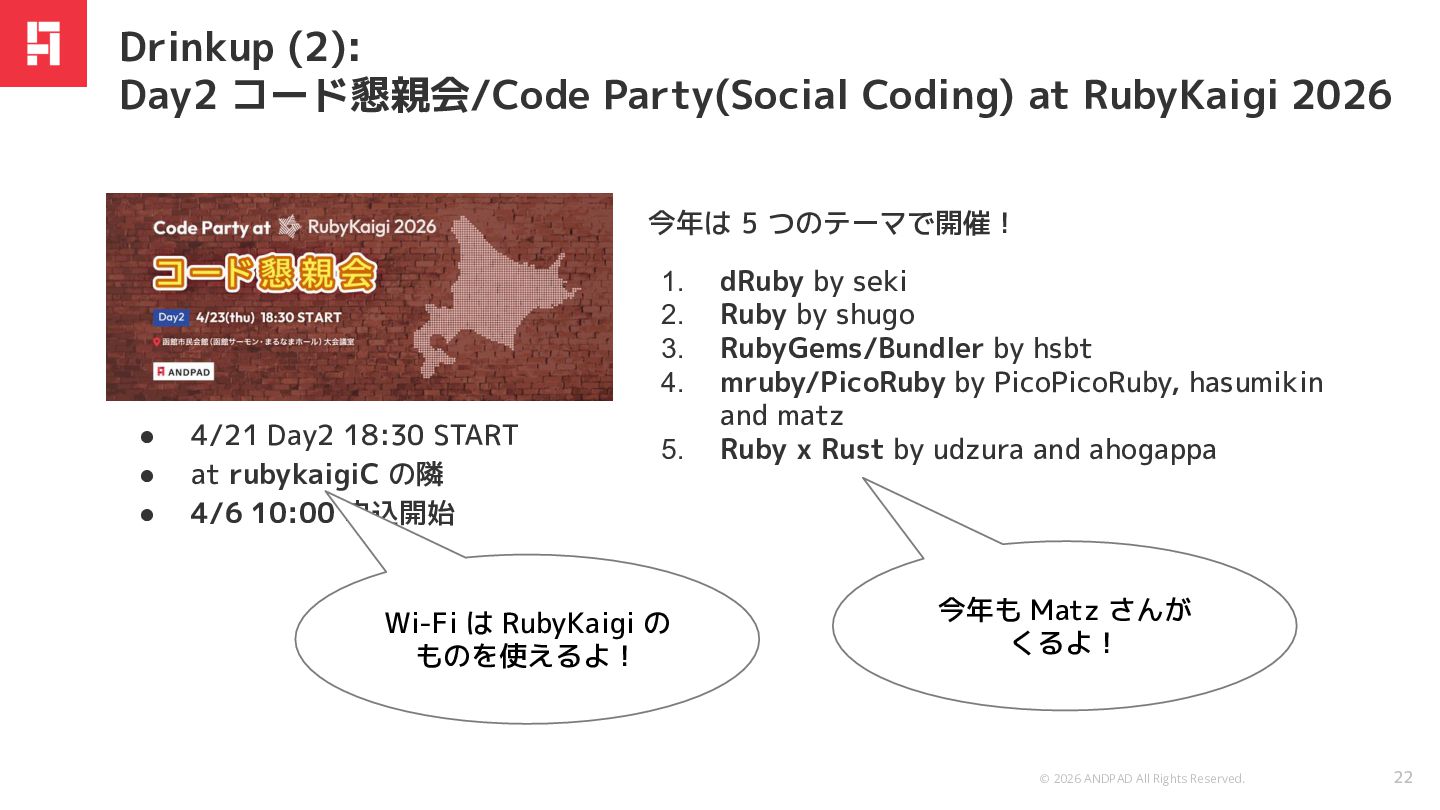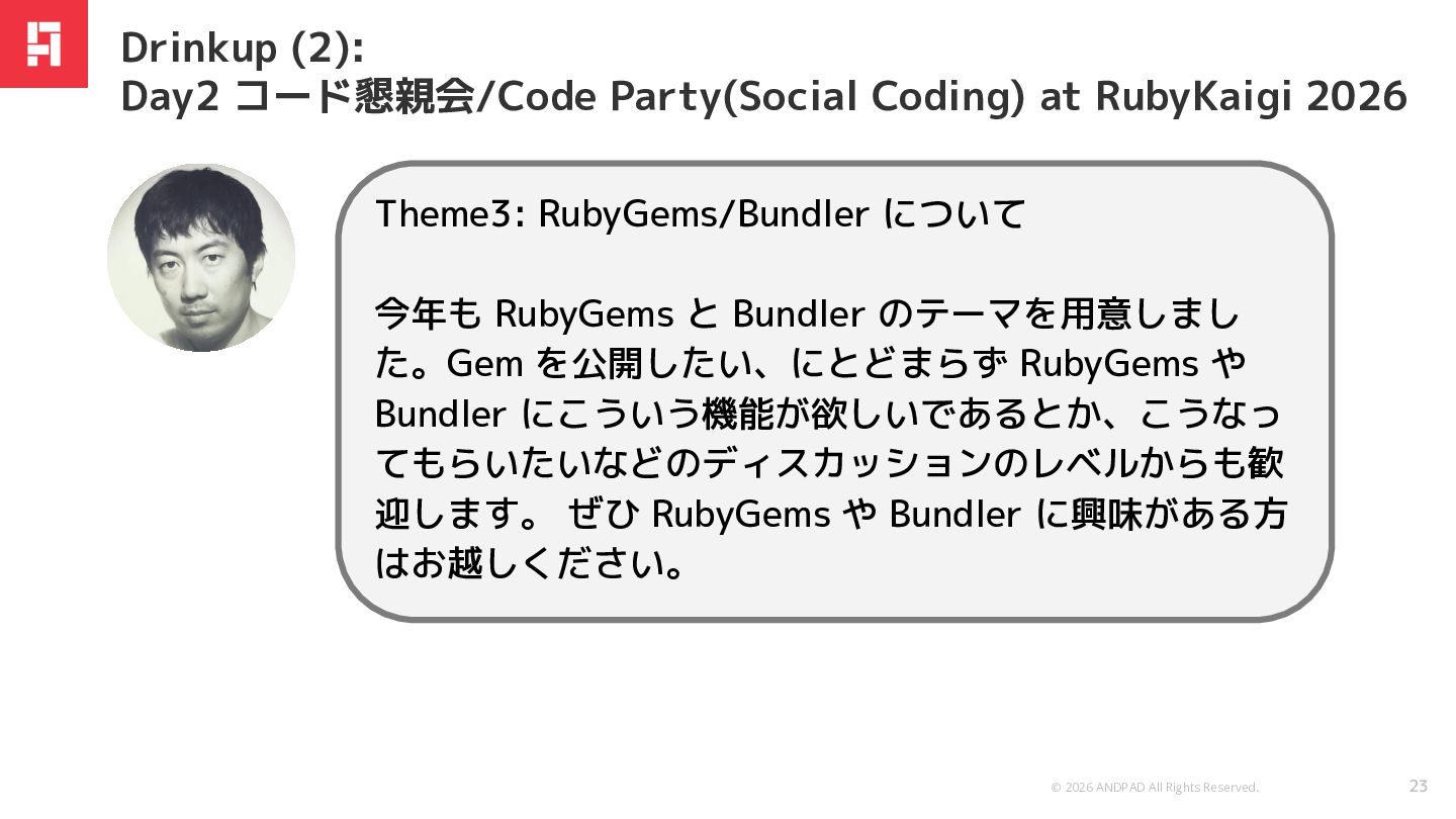 今年も RubyGems と Bundler のテーマを用意しまし た。Gem を公開したい、にとどまらず RubyGems や Bundler にこういう機能が欲しいであるとか、こうなっ てもらいたいなどのディスカッションのレベルからも歓 迎します。 ぜひ RubyGems や Bundler に興味がある方 はお越しください。 Drinkup (2): Day2 コード懇親会/Code Party(Social Coding) at RubyKaigi 2026