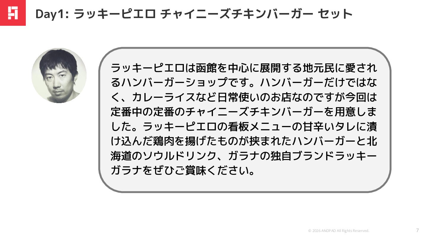 © 2026 ANDPAD All Rights Reserved. 7 Day1: ラッキーピエロ チャイニーズチキンバーガー