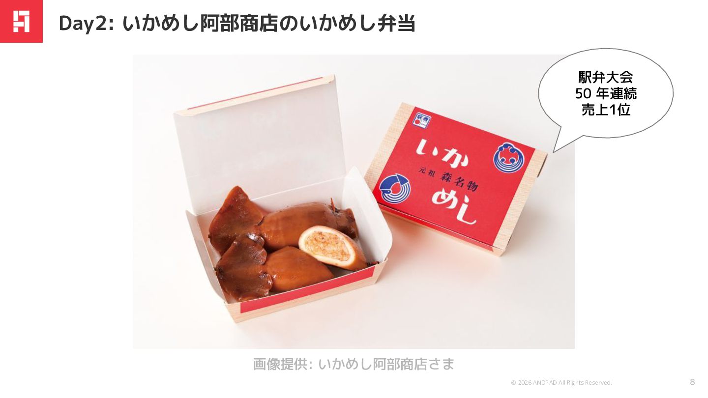© 2026 ANDPAD All Rights Reserved. 8 Day2: いかめし阿部商店のいかめし弁当 画像提供: