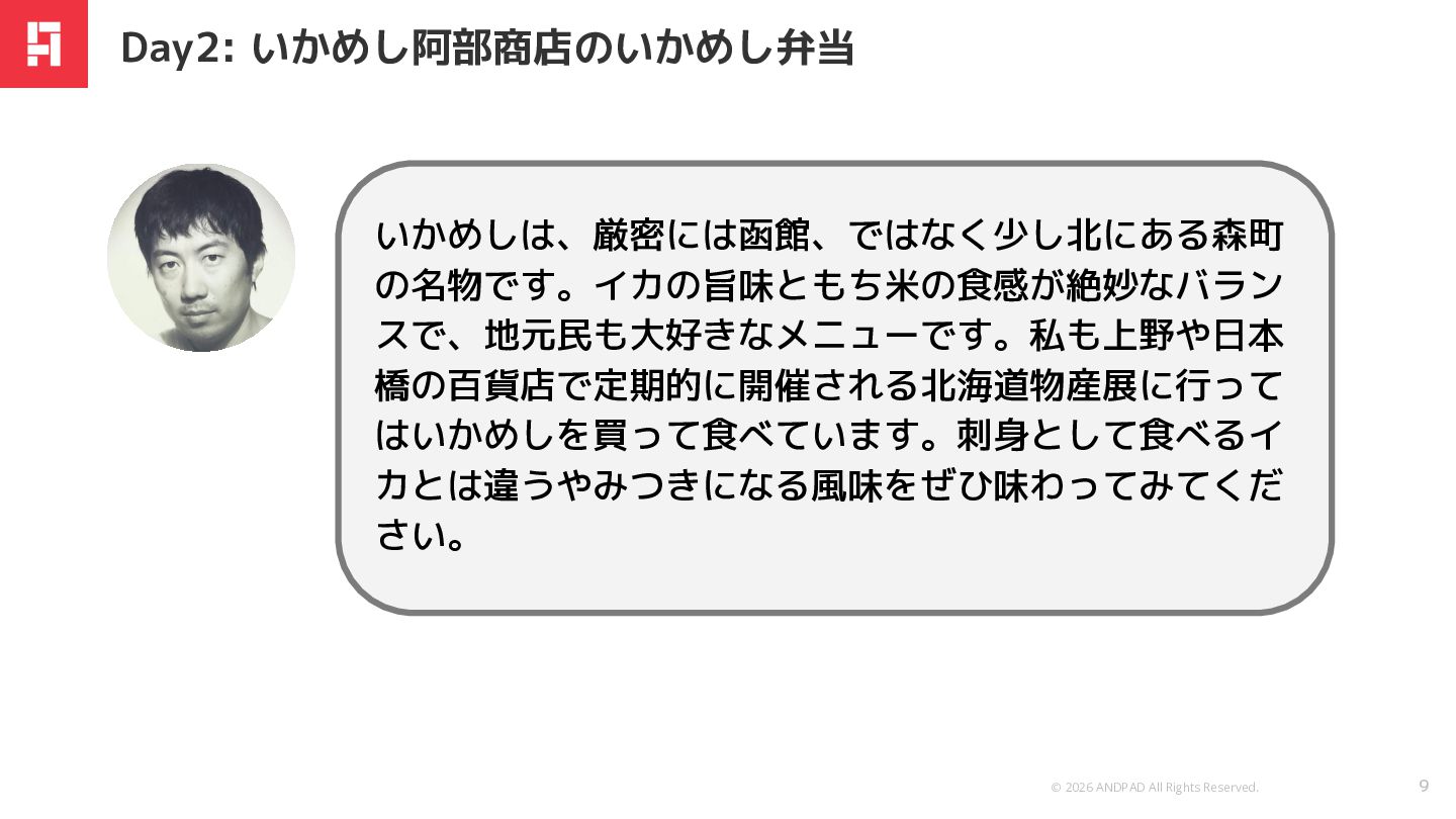 © 2026 ANDPAD All Rights Reserved. 9 いかめしは、厳密には函館、ではなく少し北にある森町 の名物です。イカの旨味ともち米の食感が絶妙なバラン スで、地元民も大好きなメニューです。私も上野や日本