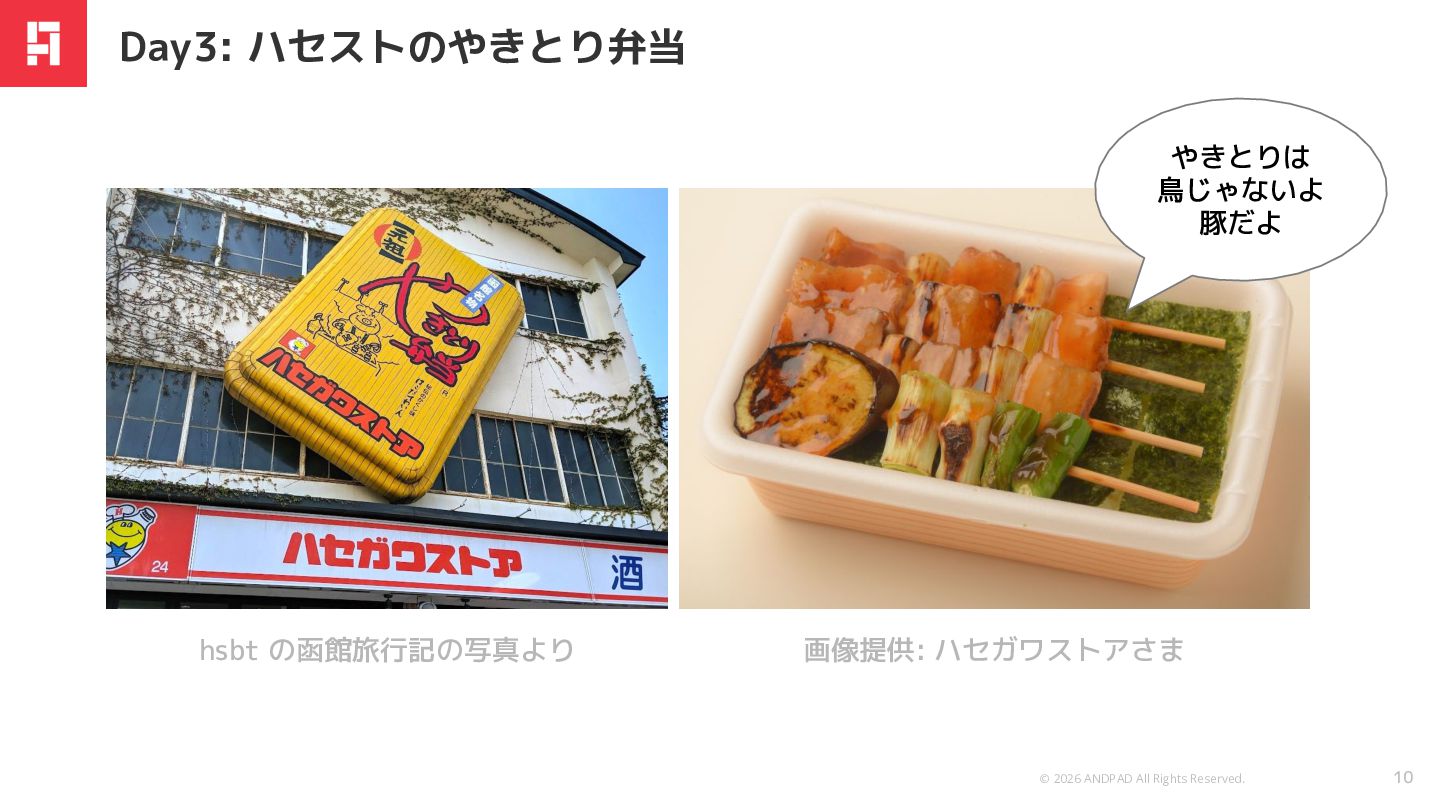 © 2026 ANDPAD All Rights Reserved. 10 Day3: ハセストのやきとり弁当 画像提供: