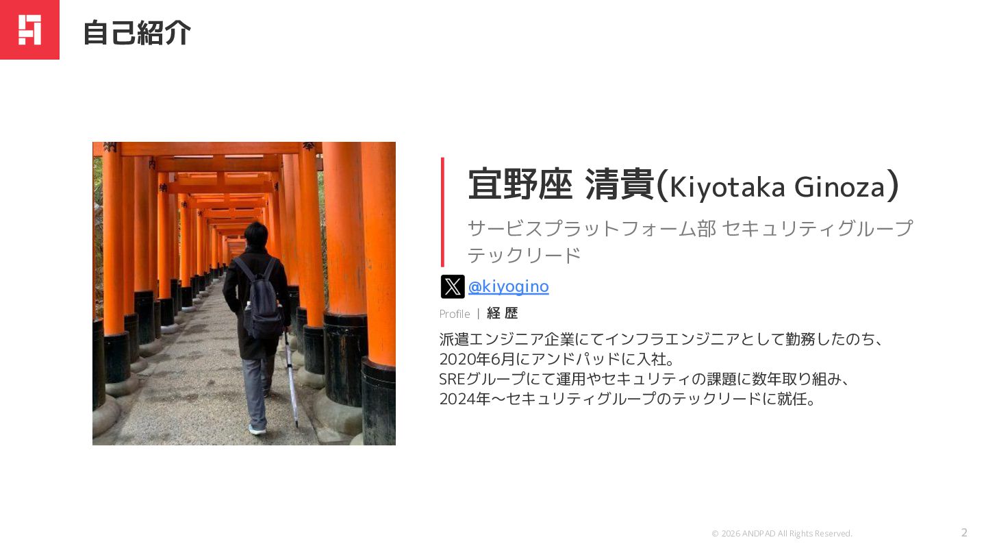 © 2026 ANDPAD All Rights Reserved. Confidential 派遣エンジニア企業にてインフラエンジニアとして勤務したのち、 2020年6月にアンドパッドに入社。 SREグループにて運用やセキュリティの課題に数年取り組み、