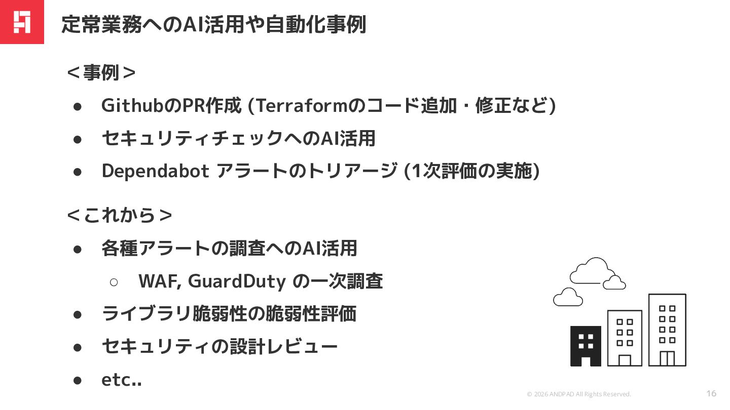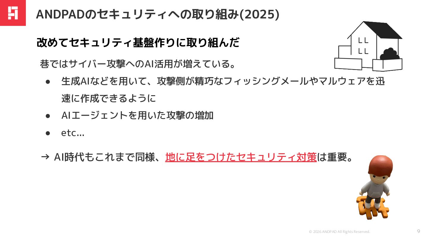 • 生成AIなどを用いて、攻撃側が精巧なフィッシングメールやマルウェアを迅 速に作成できるように • AIエージェントを用いた攻撃の増加 • etc... ANDPADのセキュリティへの取り組み(2025) → AI時代もこれまで同様、地に足をつけたセキュリティ対策は重要。