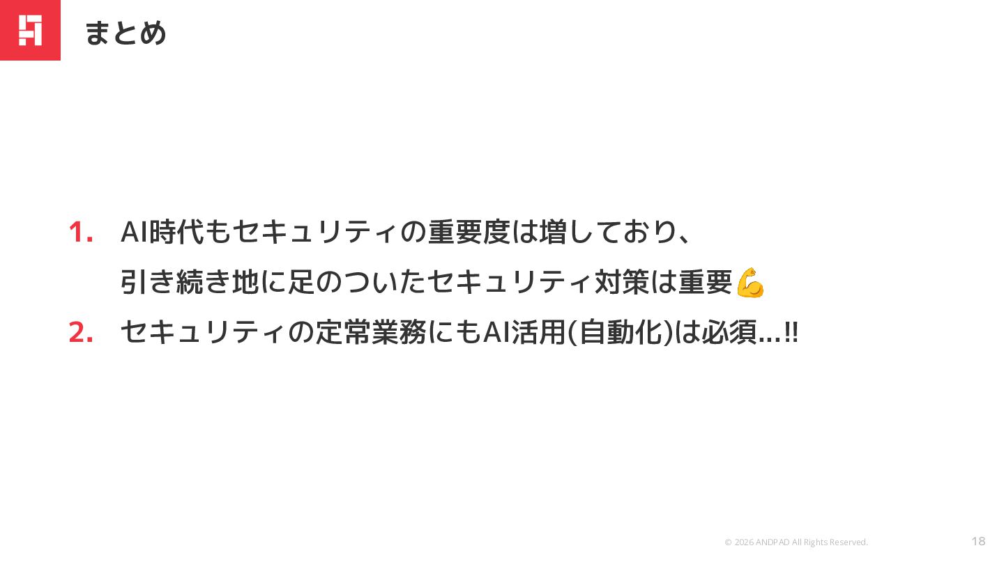 2. セキュリティの定常業務にもAI活用(自動化)は必須...!! まとめ 18