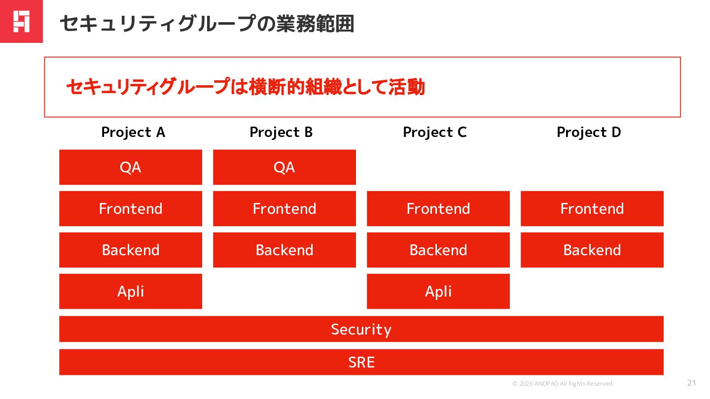 Apli QA Frontend Backend QA Frontend Backend Apli Project A Project B Project C Frontend Backend Project D セキュリティグループは横断的組織として活動 21 セキュリティグループの業務範囲 SRE