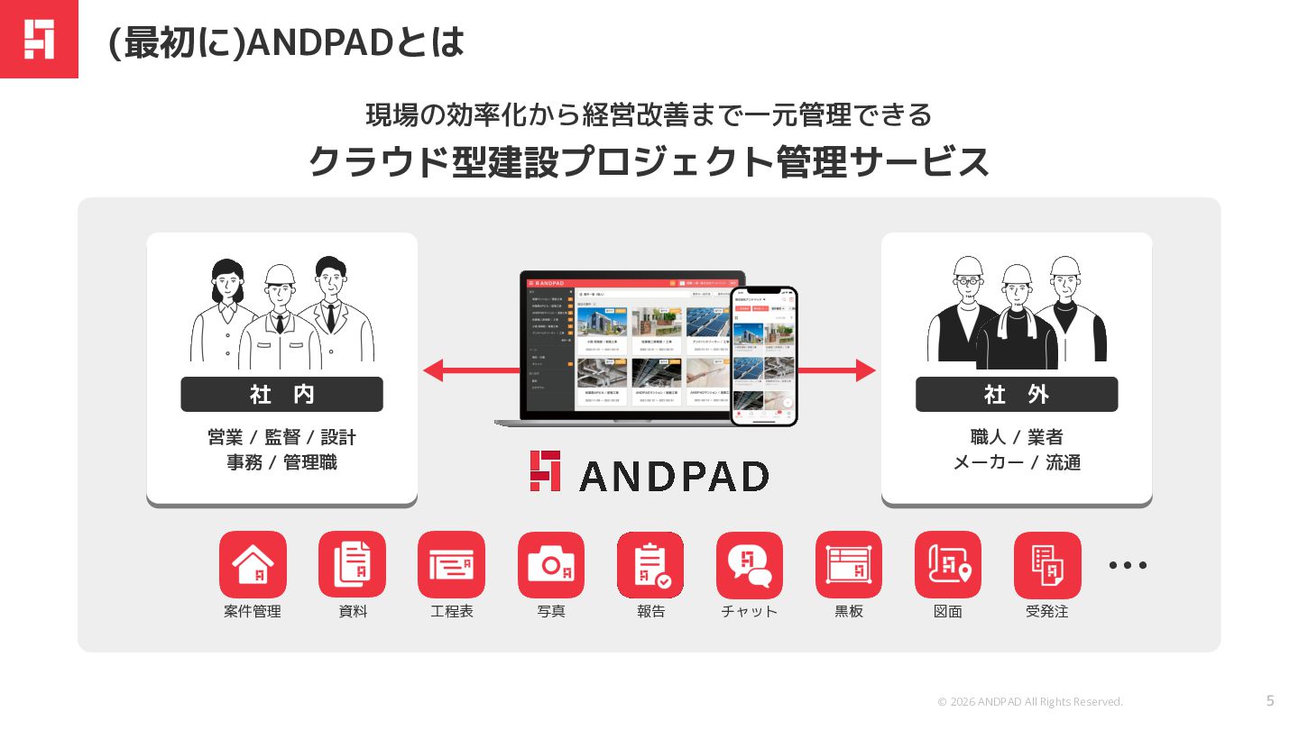 © 2026 ANDPAD All Rights Reserved. Confidential 現場の効率化から経営改善まで一元管理できる クラウド型建設プロジェクト管理サービス 社 内