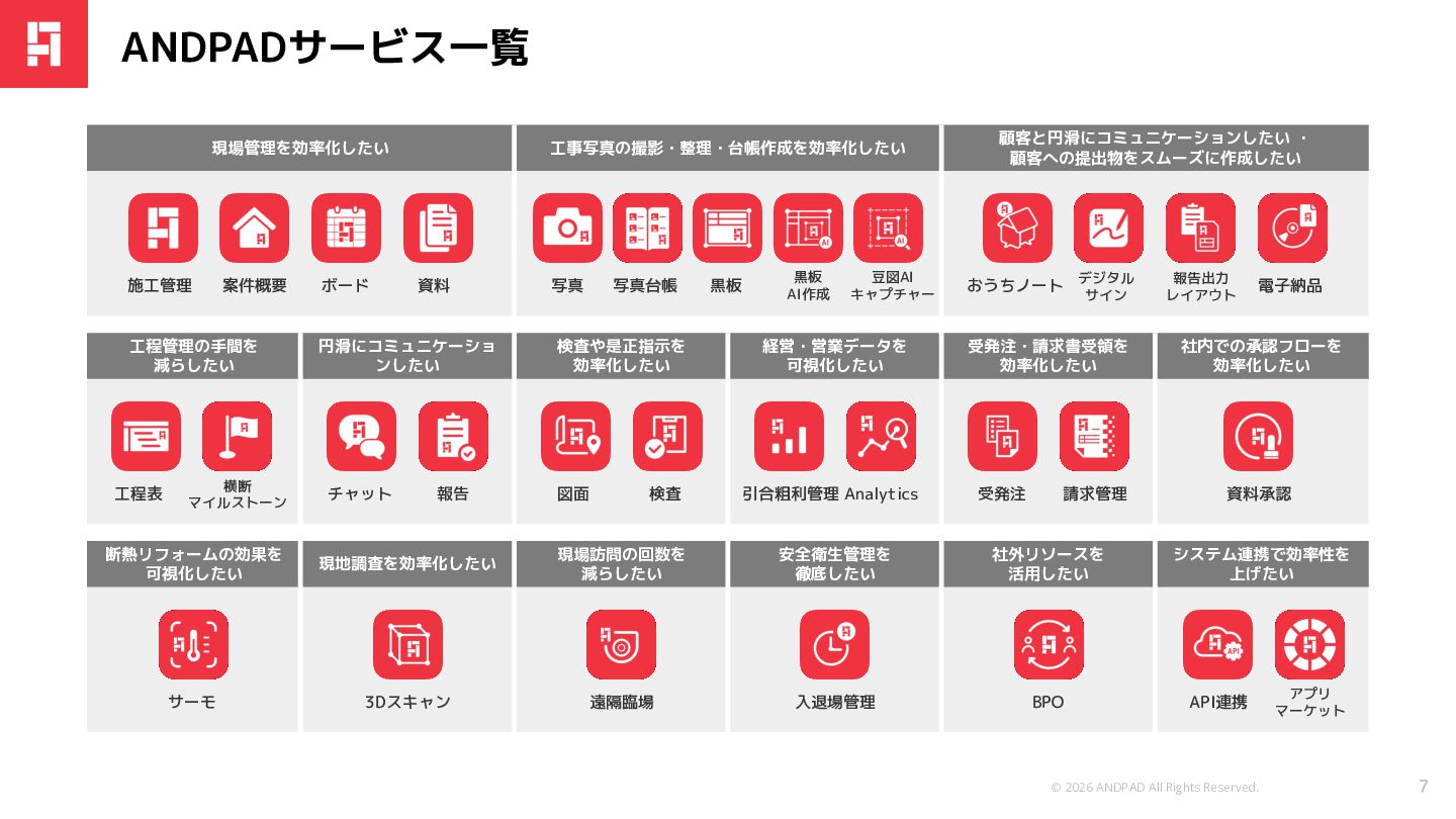 © 2026 ANDPAD All Rights Reserved. Confidential ANDPADサービス一覧 現場管理を効率化したい 工事写真の撮影・整理・台帳作成を効率化したい