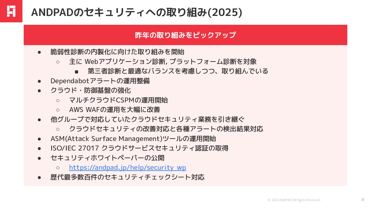 • 脆弱性診断の内製化に向けた取り組みを開始 ◦ 主に Webアプリケーション診断, プラットフォーム診断を対象 ▪ 第三者診断と最適なバランスを考慮しつつ、取り組んでいる • Dependabotアラートの運用整備 • クラウド・防御基盤の強化 ◦ マルチクラウドCSPMの運用開始 ◦ AWS WAFの運用を大幅に改善 • 他グループで対応していたクラウドセキュリティ業務を引き継ぐ ◦ クラウドセキュリティの改善対応と各種アラートの検出結果対応 • ASM(Attack Surface Management)ツールの運用開始 • ISO/IEC 27017 クラウドサービスセキュリティ認証の取得 • セキュリティホワイトペーパーの公開 ◦ https://andpad.jp/help/security_wp • 歴代最多数百件のセキュリティチェックシート対応