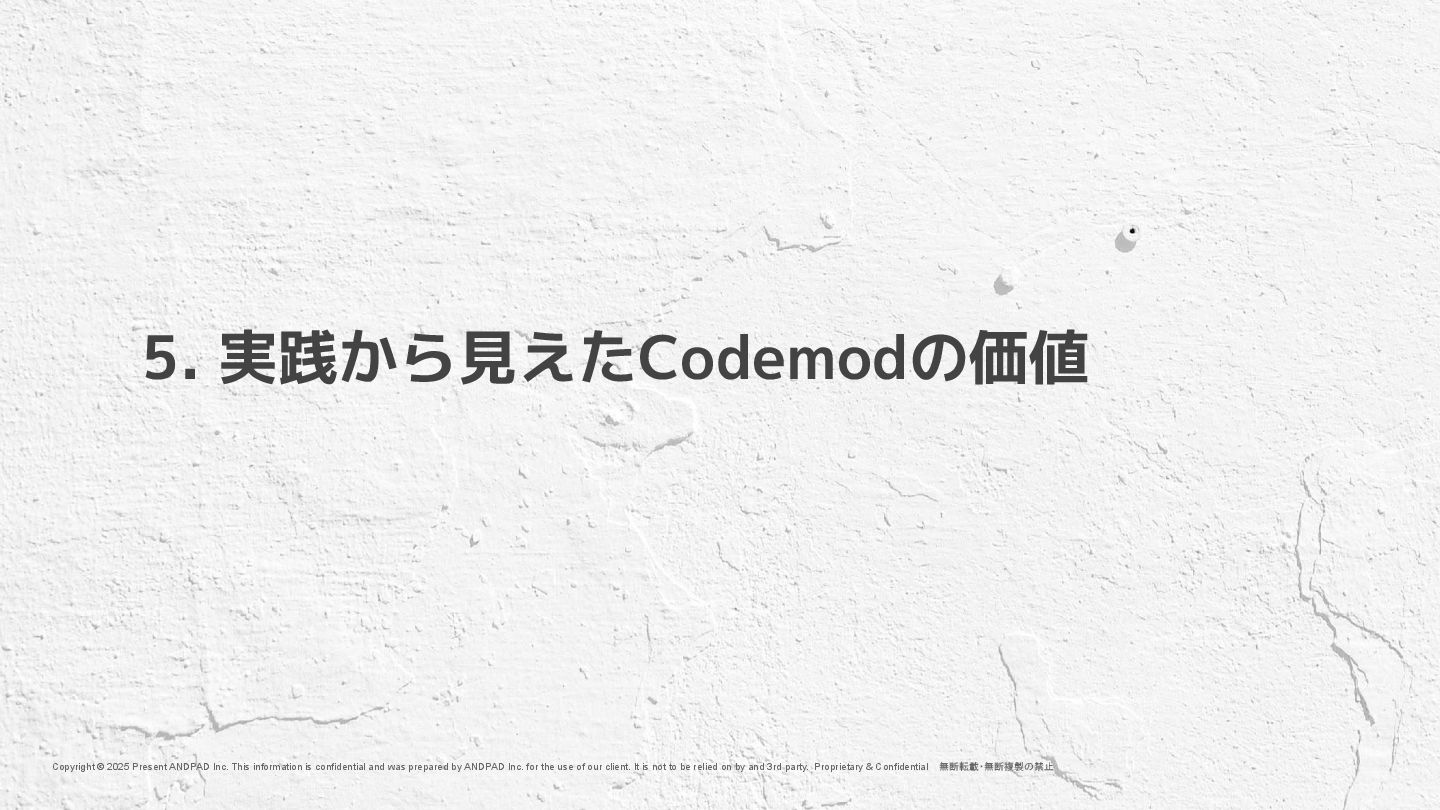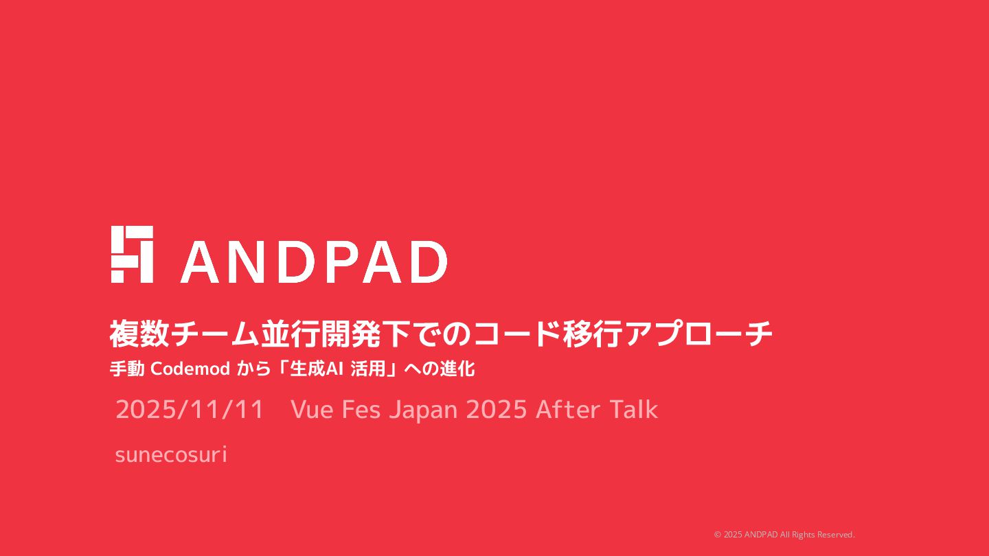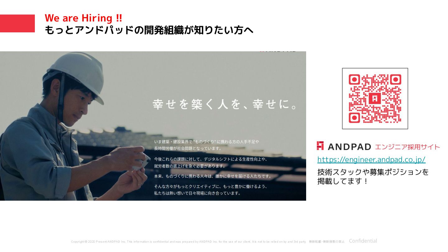 and was prepared by ANDPAD Inc. for the use of our client. It is not to be relied on by and 3rd party. 無断転載・無断複製の禁止 Confidential We are Hiring !! もっとアンドパッドの開発組織が知りたい方へ https://engineer.andpad.co.jp/ 技術スタックや募集ポジションを 掲載してます!