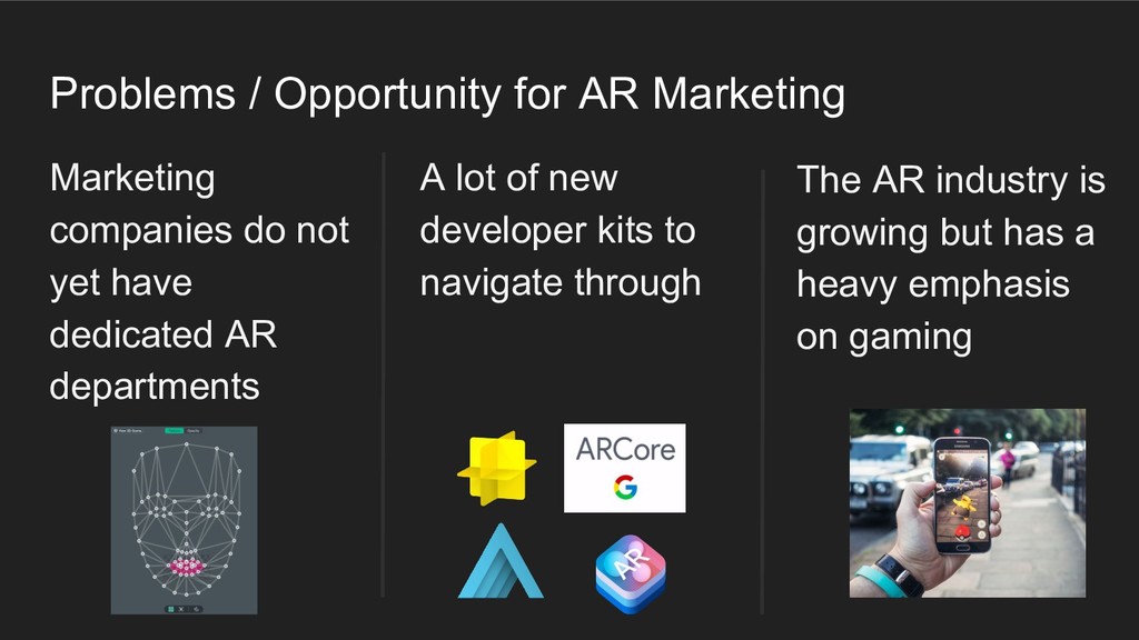 yet have dedicated AR departments A lot of new developer kits to navigate through The AR industry is growing but has a heavy emphasis on gaming