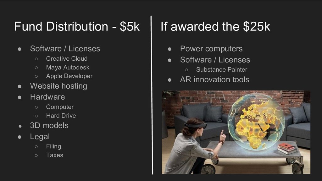 Cloud ◦ Maya Autodesk ◦ Apple Developer • Website hosting • Hardware ◦ Computer ◦ Hard Drive • 3D models • Legal ◦ Filing ◦ Taxes • Power computers • Software / Licenses ◦ Substance Painter • AR innovation tools If awarded the $25k