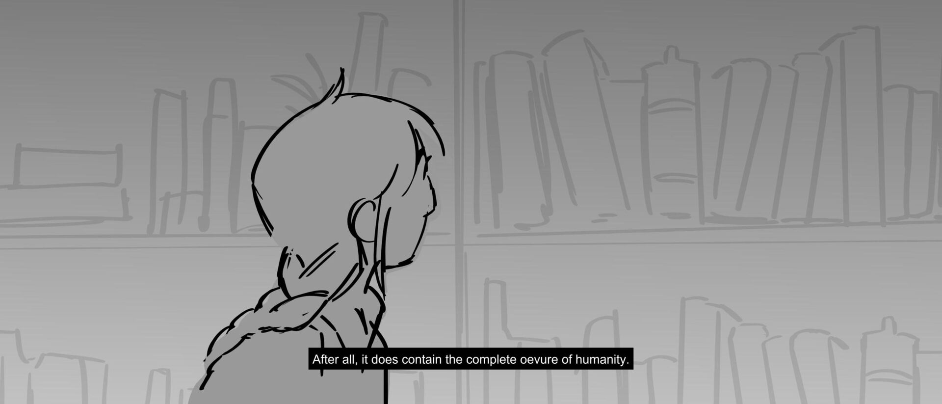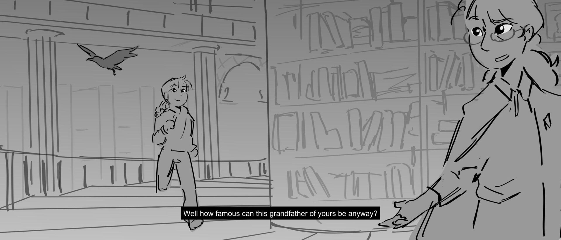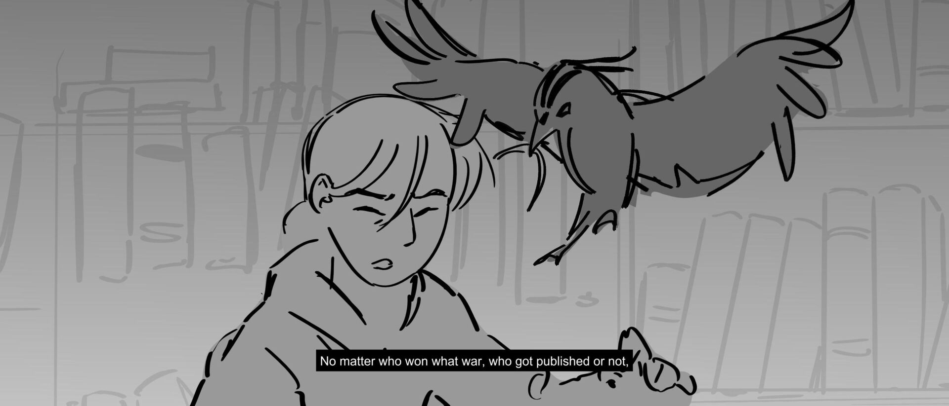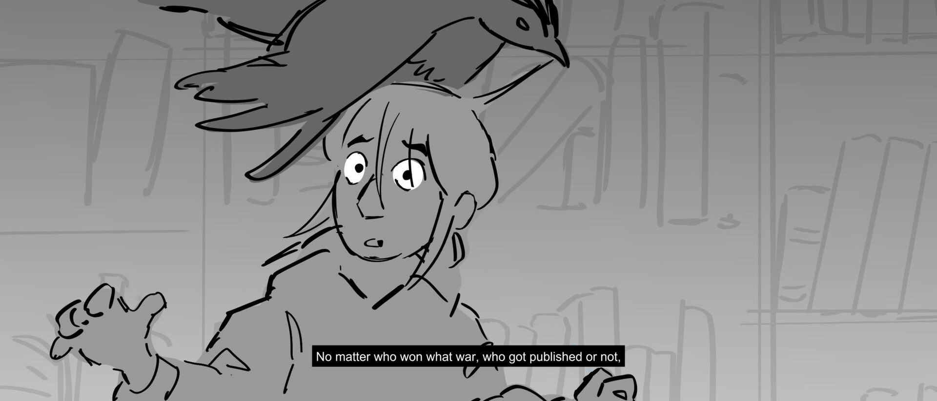 The curious grandson of a famous writer uncovers the massive, unending hallways of a library, guarded by birds of prey and one very kind librarian. Within the halls, however, lies the existence of one unwelcomed intruder that puts the entire knowledge of humanity ever written down at risk of being destroyed.
