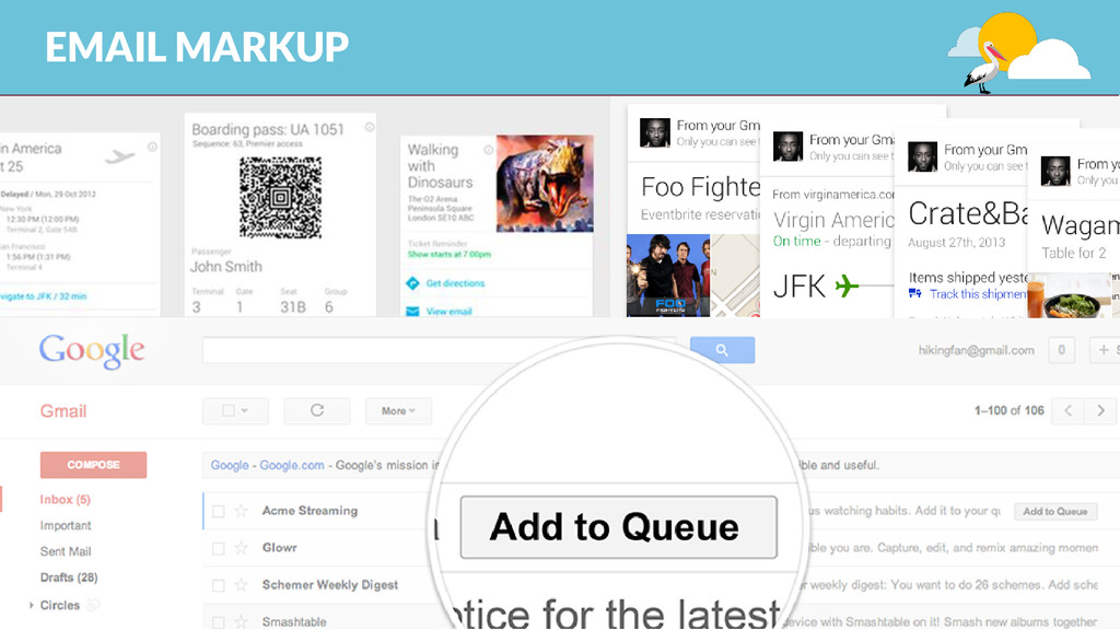 TO HAVE A GOOD REPUTATION https://support.google.com/mail/answer/81126?hl=en https://postmaster.google.com SEND A GOOD AMOUNT OF MAIL/DAY At least 100 per day to gmail addresses REGISTER https://developers.google.com/gmail/markup/registering-with-google 1 AUTHENTICATE MAIL THROUGH DKIM O SPF https://support.google.com/mail/answer/180707?hl=en# GOOGLE SEARCH ORGANIC EMAIL MARKUP