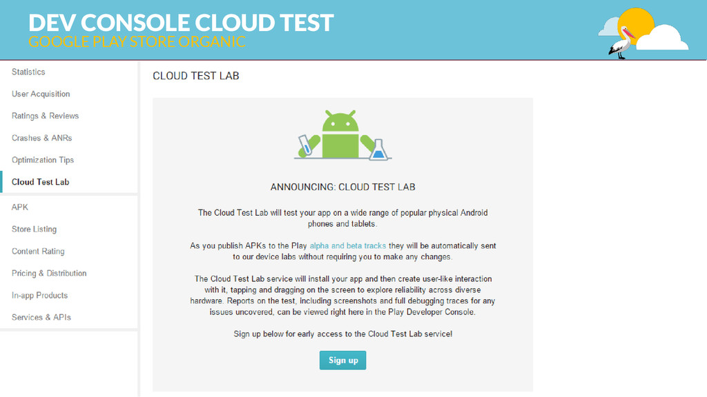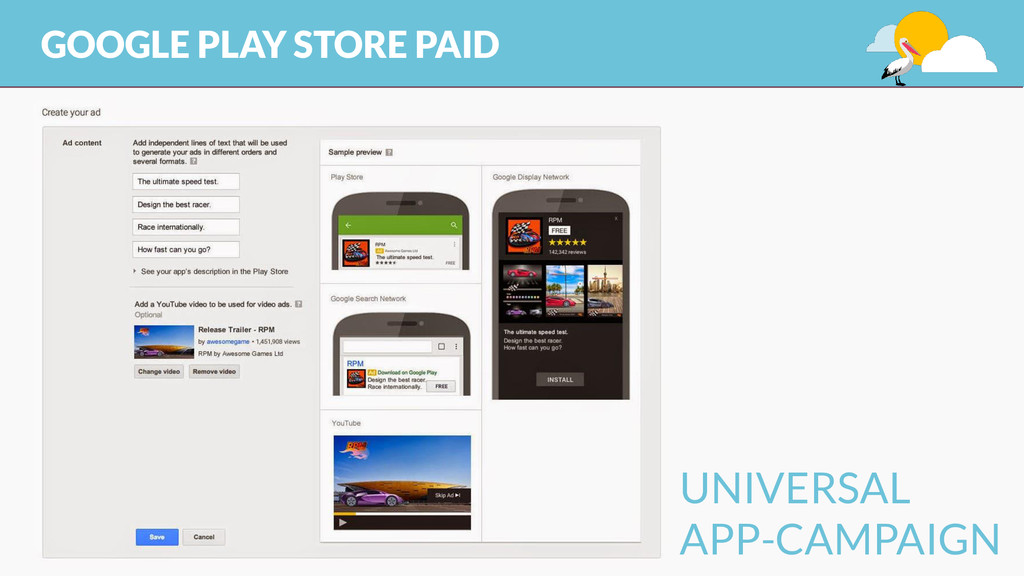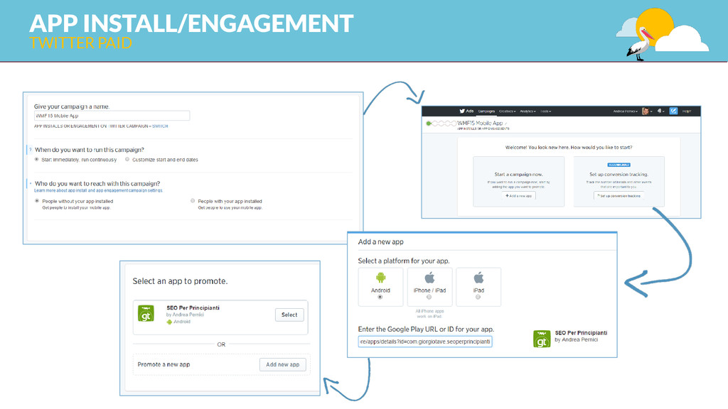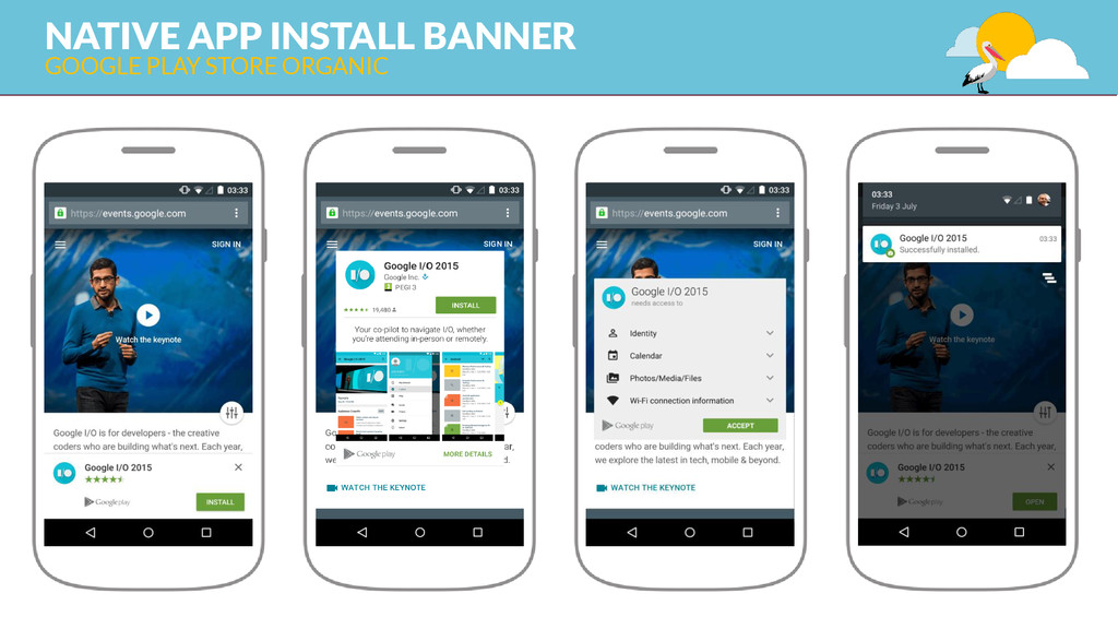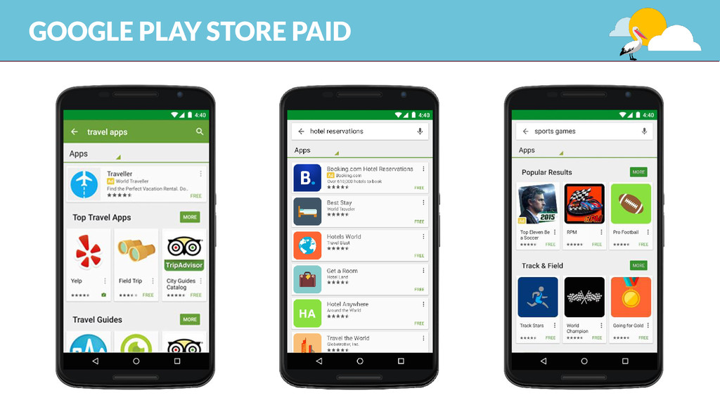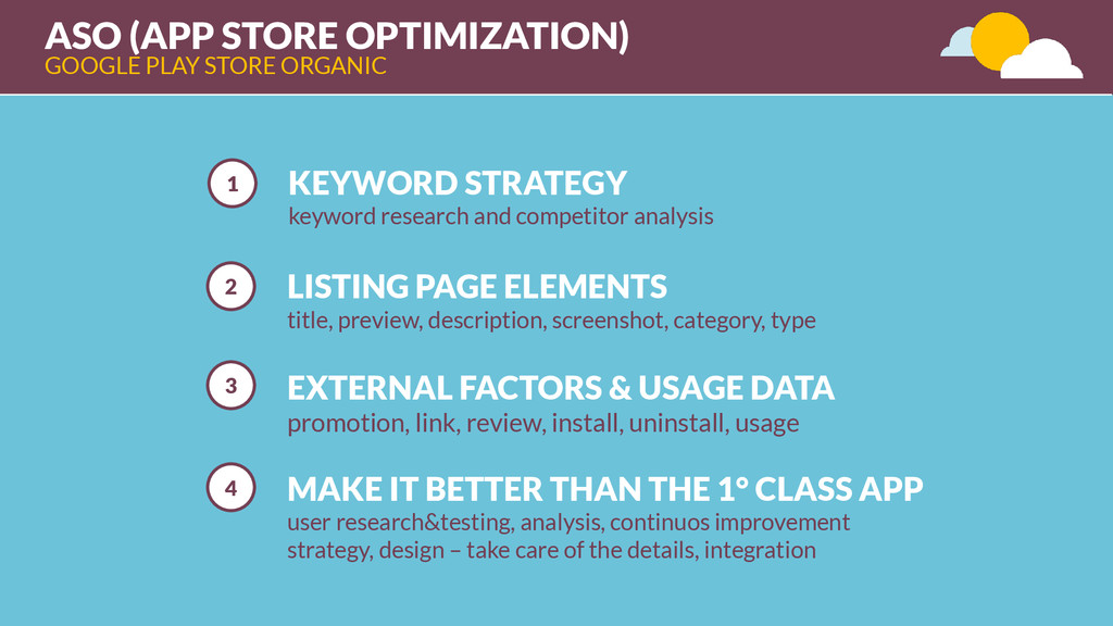 category, type EXTERNAL FACTORS & USAGE DATA promotion, link, review, install, uninstall, usage MAKE IT BETTER THAN THE 1° CLASS APP user research&testing, analysis, continuos improvement strategy, design – take care of the details, integration 1 KEYWORD STRATEGY keyword research and competitor analysis GOOGLE PLAY STORE ORGANIC ASO (APP STORE OPTIMIZATION)