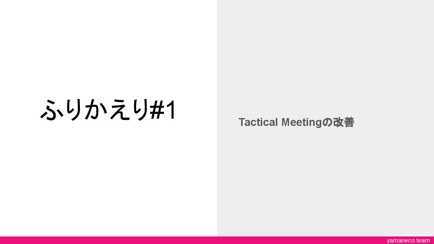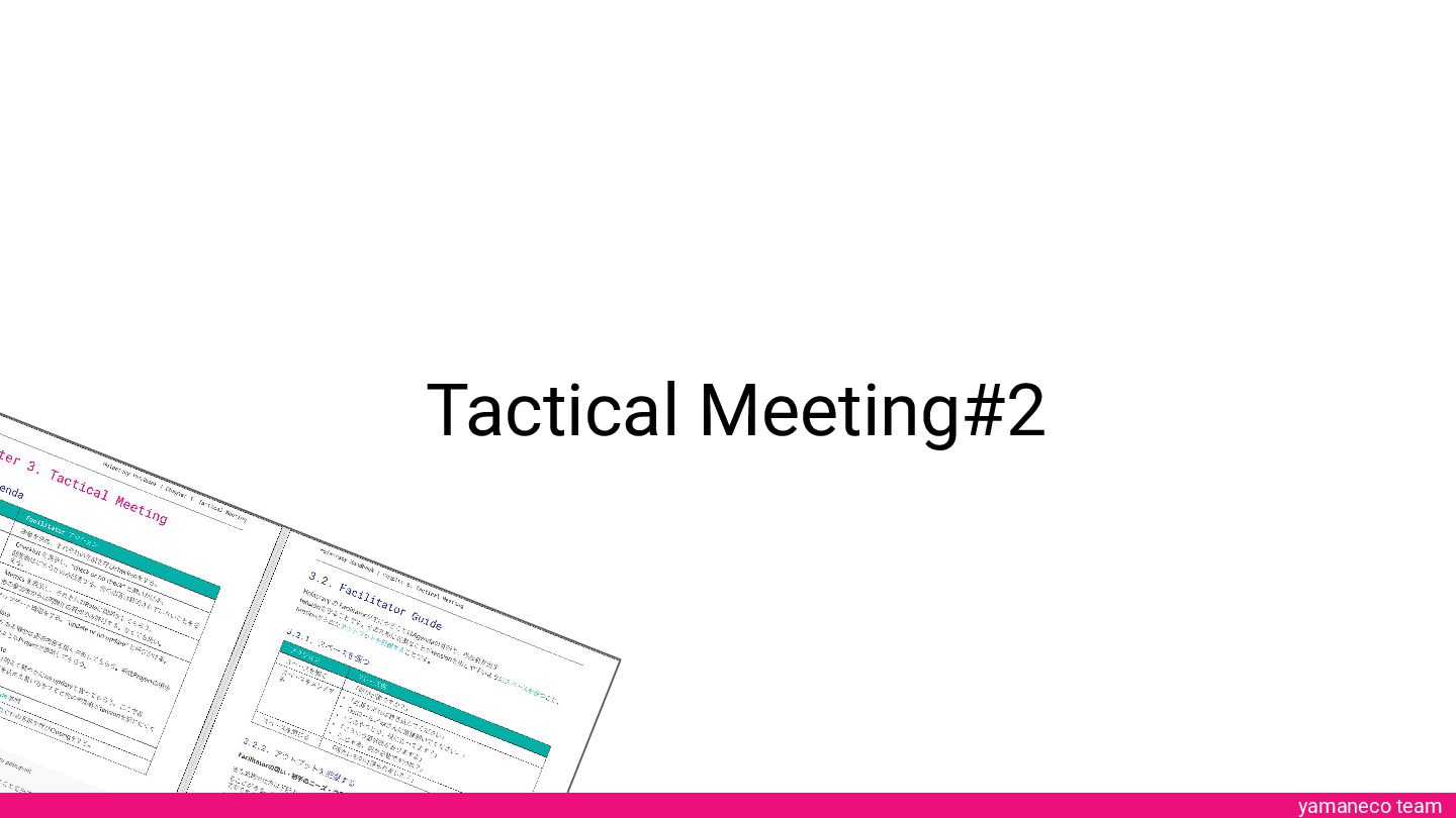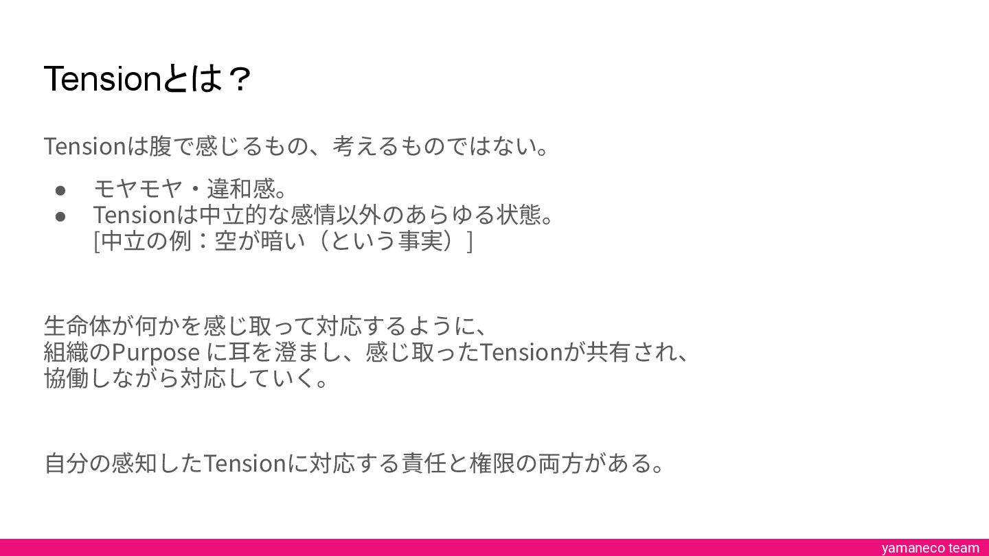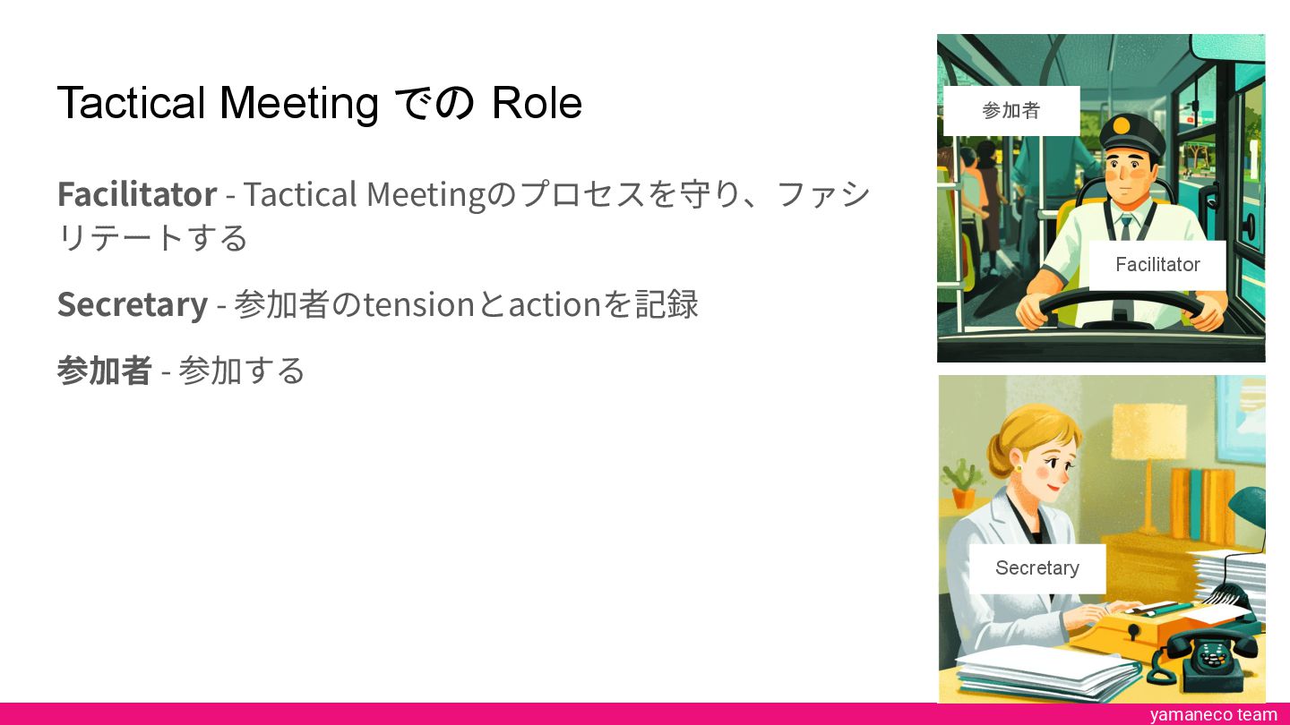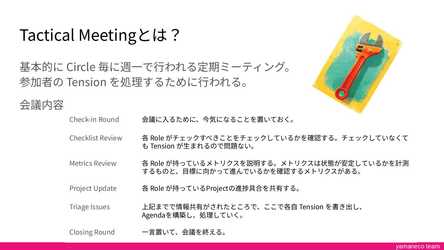 team Check-in Round 会議に⼊るために、今気になることを置いておく。 Checklist Review 各 Role がチェックすべきことをチェックしているかを確認する。チェックしていなくて も Tension が⽣まれるので問題ない。 Metrics Review 各 Role が持っているメトリクスを説明する。メトリクスは状態が安定しているかを計測 するものと、⽬標に向かって進んでいるかを確認するメトリクスがある。 Project Update 各 Role が持っているProjectの進捗具合を共有する。 Triage Issues 上記までで情報共有がされたところで、ここで各⾃ Tension を書き出し、 Agendaを構築し、処理していく。 Closing Round ⼀⾔置いて、会議を終える。