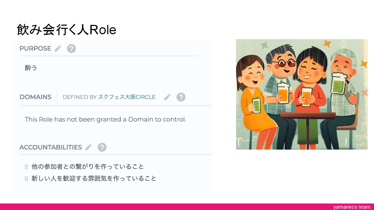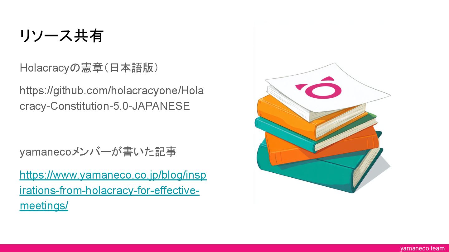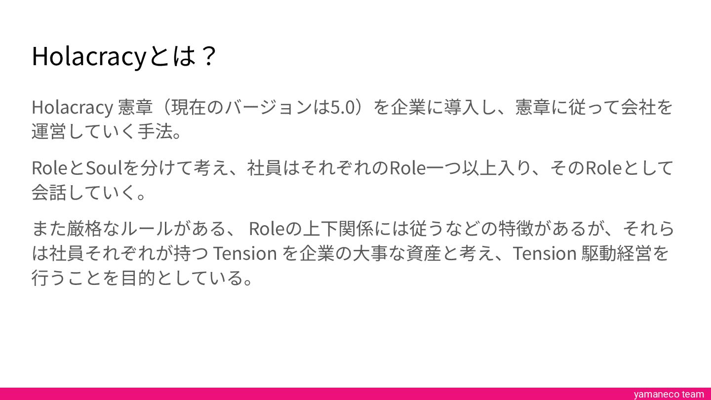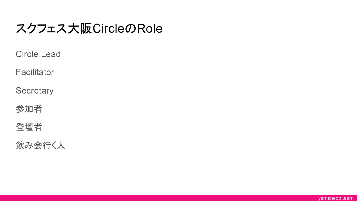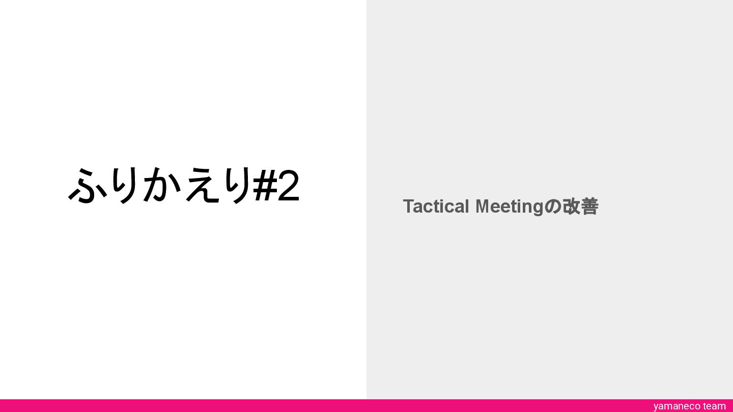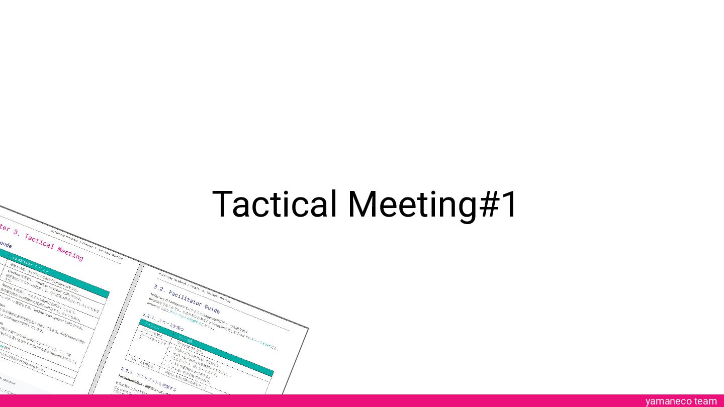 team Check-in Round 会議に⼊るために、今気になることを置いておく。 Checklist Review 各 Role がチェックすべきことをチェックしているかを確認する。チェックしていなくて も Tension が⽣まれるので問題ない。 Metrics Review 各 Role が持っているメトリクスを説明する。メトリクスは状態が安定しているかを計測 するものと、⽬標に向かって進んでいるかを確認するメトリクスがある。 Project Update 各 Role が持っているProjectの進捗具合を共有する。 Triage Issues 上記までで情報共有がされたところで、ここで各⾃ Tension を書き出し、 Agendaを構築し、処理していく。 Closing Round ⼀⾔置いて、会議を終える。