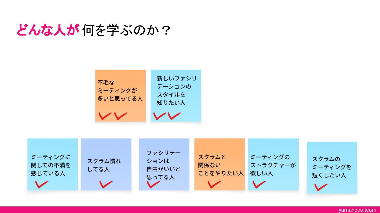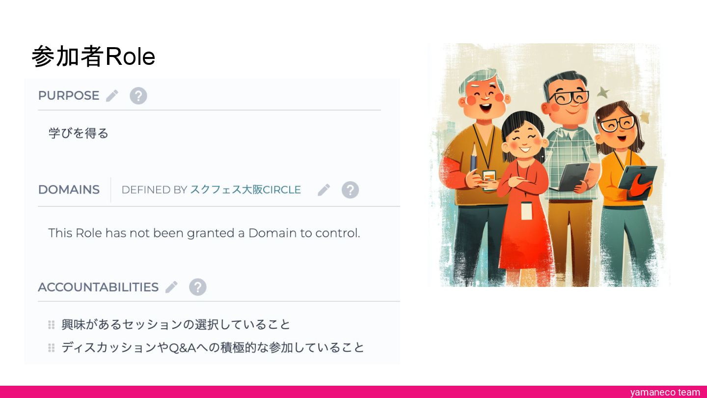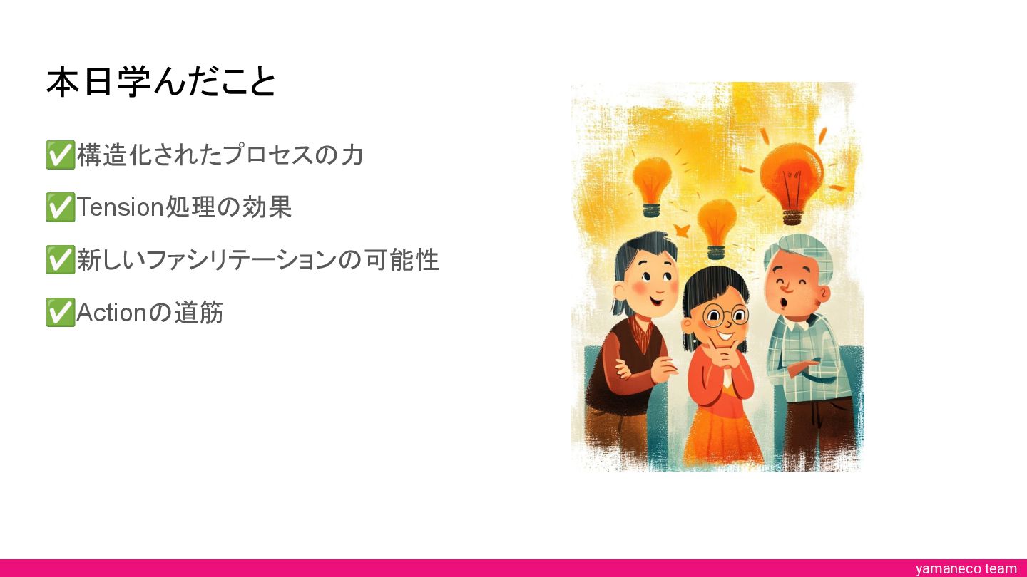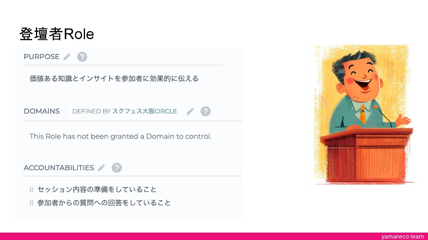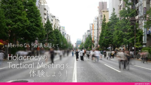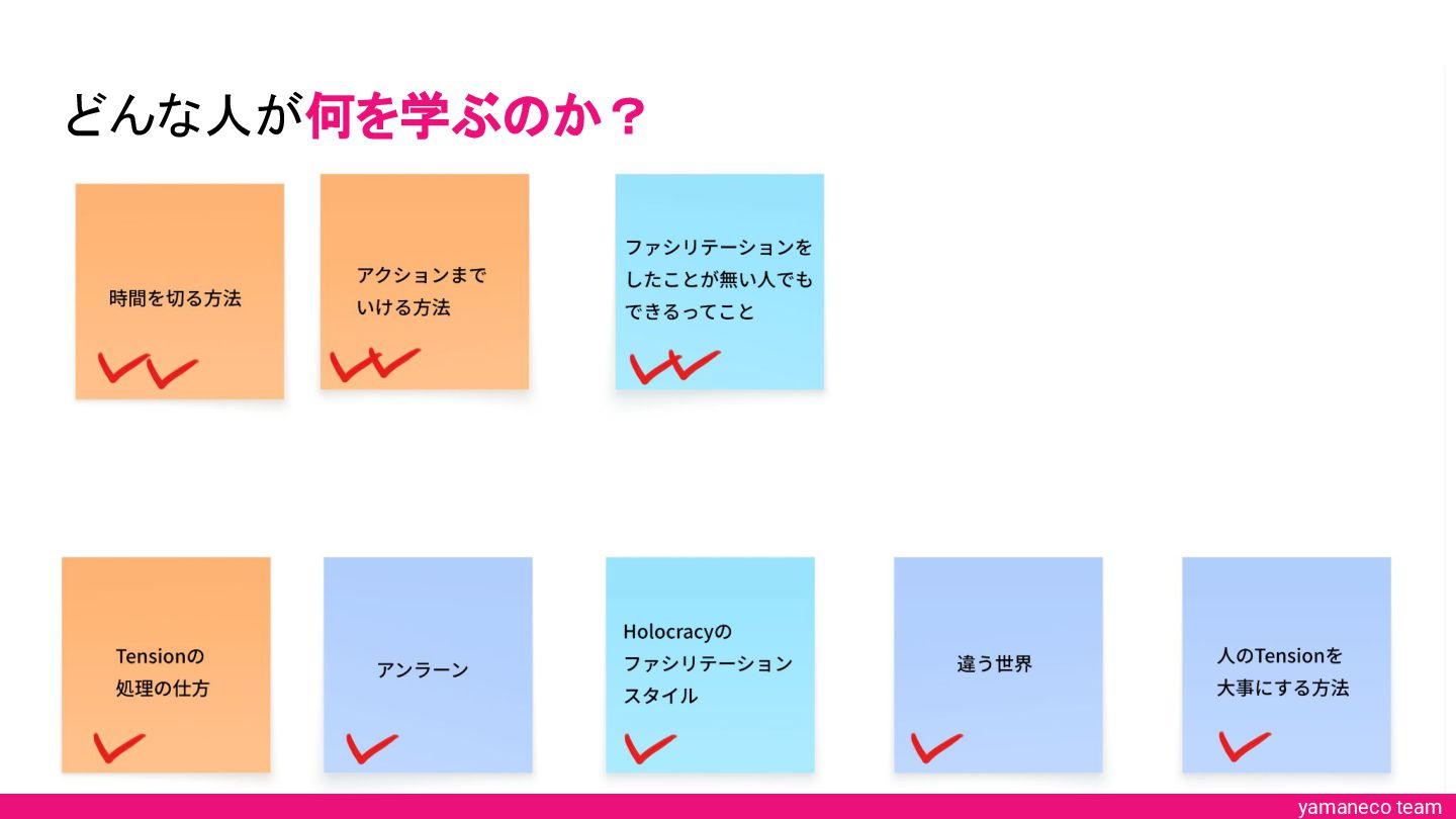 team Check-in Round 会議に⼊るために、今気になることを置いておく。 Checklist Review 各 Role がチェックすべきことをチェックしているかを確認する。チェックしていなくて も Tension が⽣まれるので問題ない。 Metrics Review 各 Role が持っているメトリクスを説明する。メトリクスは状態が安定しているかを計測 するものと、⽬標に向かって進んでいるかを確認するメトリクスがある。 Project Update 各 Role が持っているProjectの進捗具合を共有する。 Triage Issues 上記までで情報共有がされたところで、ここで各⾃ Tension を書き出し、 Agendaを構築し、処理していく。 Closing Round ⼀⾔置いて、会議を終える。